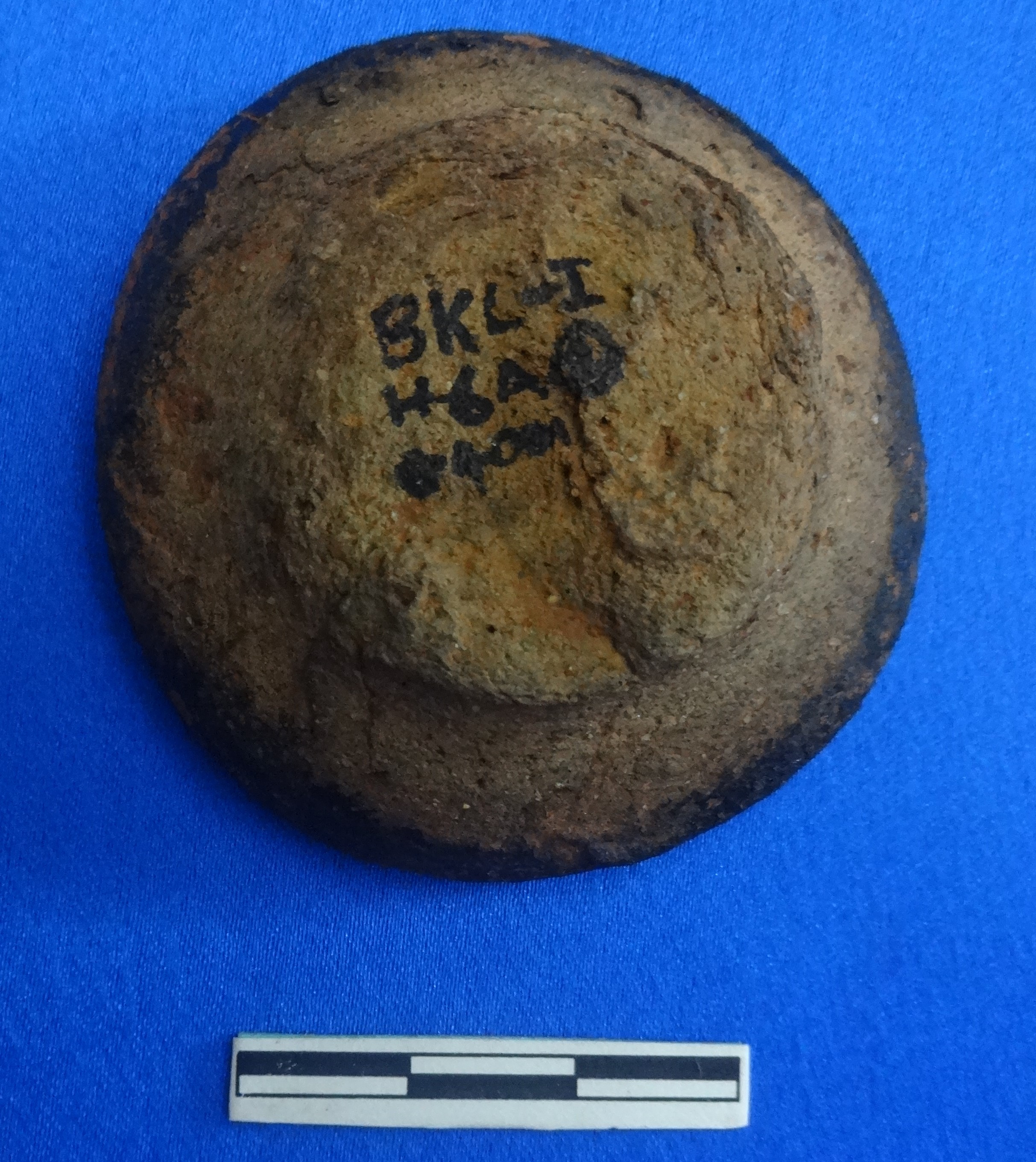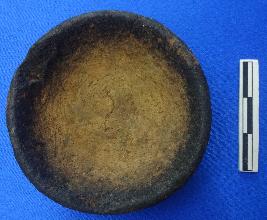 Lamp of dull red ware with black slip in and around the rim. It has a sharp round rim and a discular flat base.