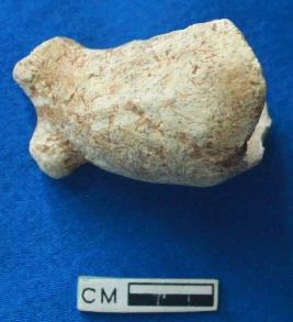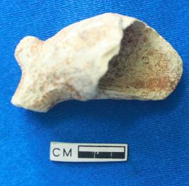 | Description / विवरण | Tobacco pipe broken at the top portion. It is having a wider body part and tail end like projections at the proximal end. One of the projections has a perforation. |