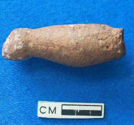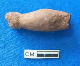 | Description / विवरण | Cylindrical netsinker with a short rounded distal end, a constricted neck and a bulged body. It is made out of fine clay and is well fired. |