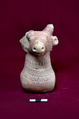 | Description / विवरण | Heavily ornamented terracotta bull probably a toy cart. There is a hole at the back and at the base of the cart. |