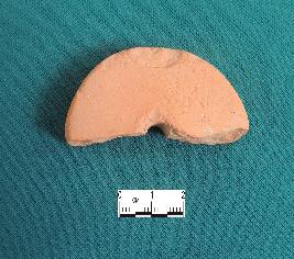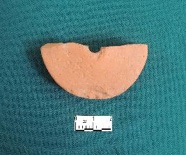 | Description / विवरण | Fragment of a reddish wheel, made of well levigated clay, well fired having a central hole. Its half portion is missing. |