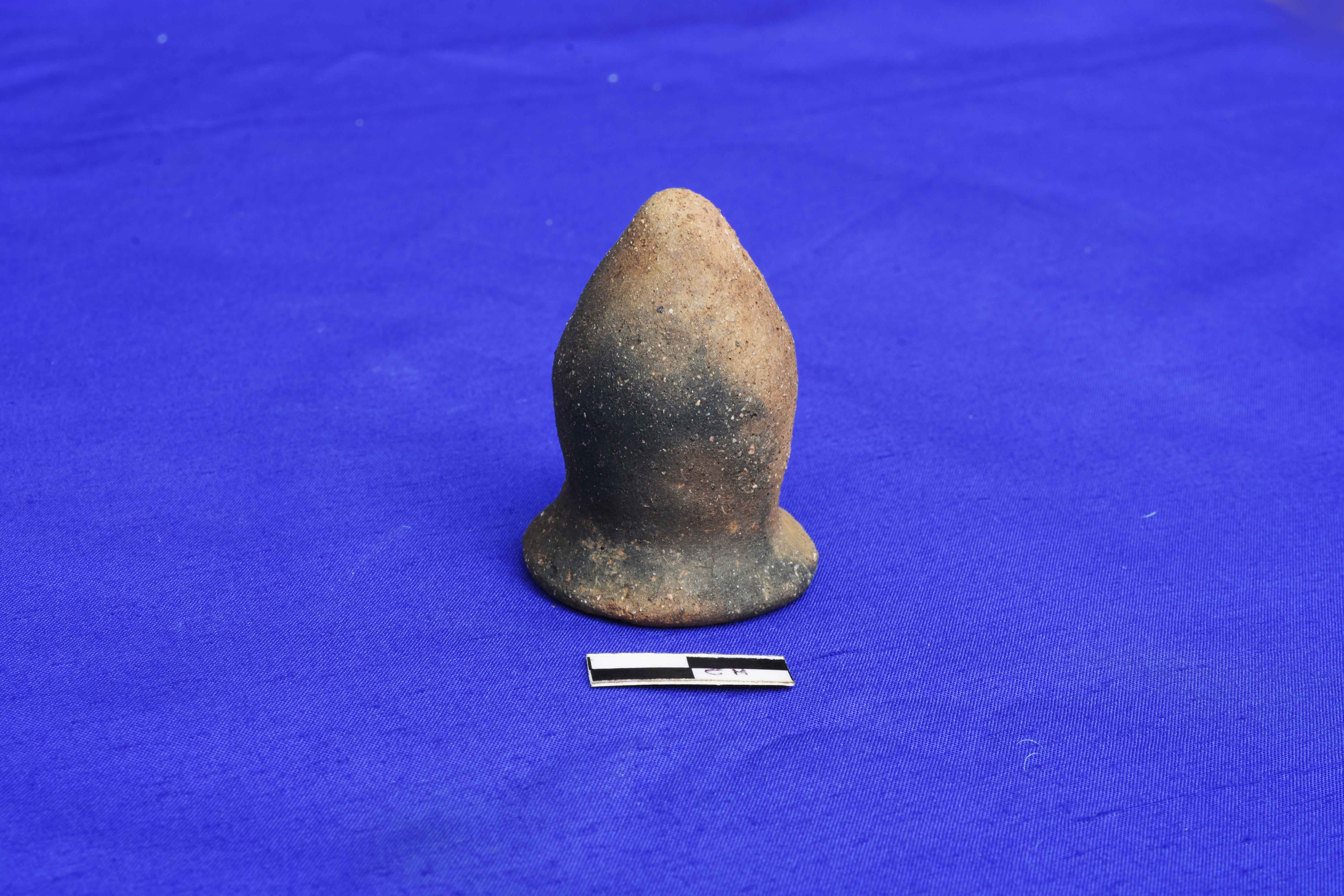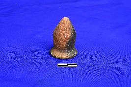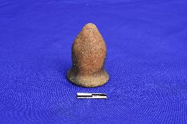 A terracotta gamesmen with circular and flat base . It is conical in shape with bulbous body.