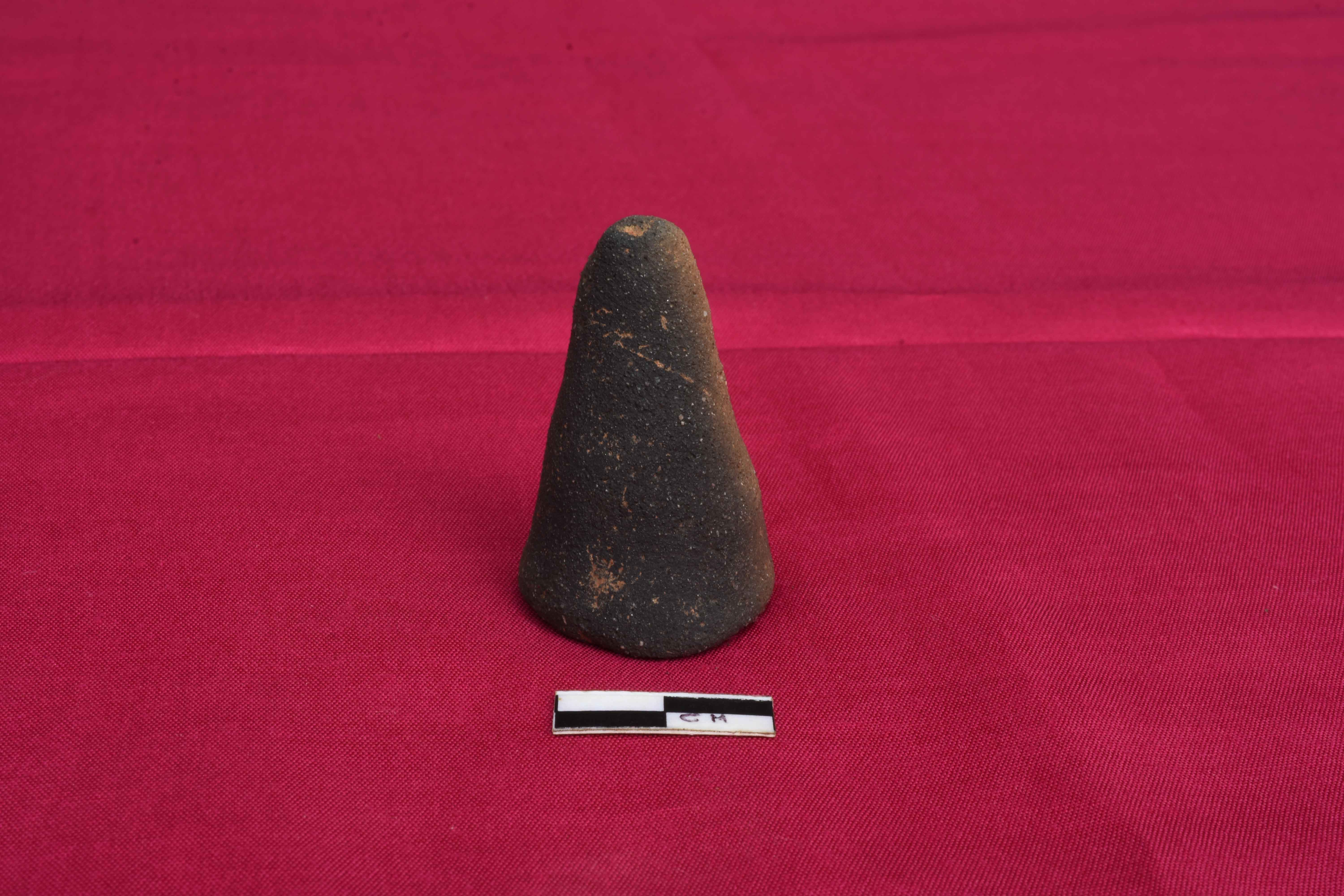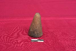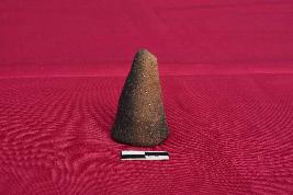 A terracotta Games-men with conical shape. It is ill fired, dull red in colour and have rough coarse surface. One half is black in colour.