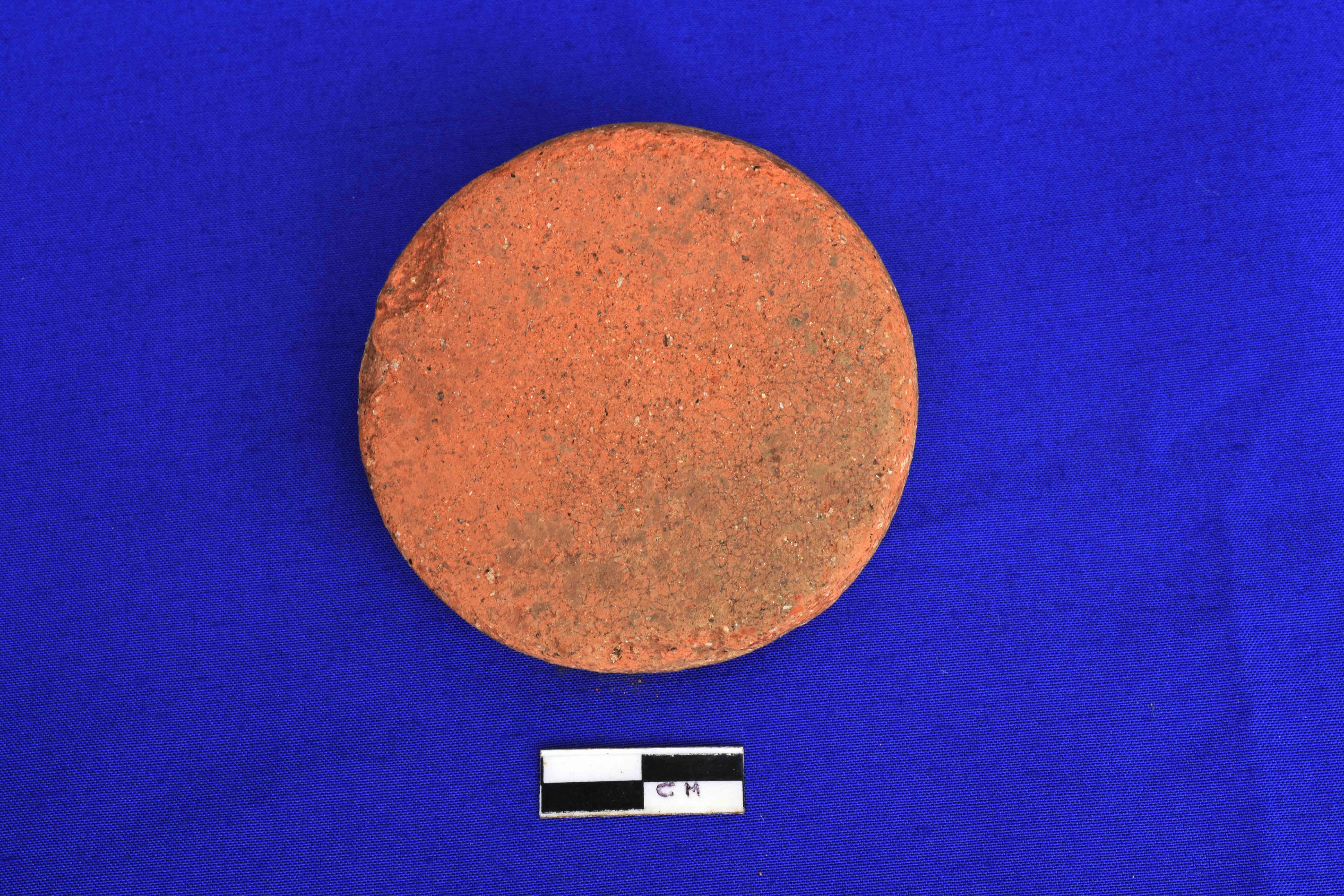 A Terracotta Hopscotch with one rough side and sand particles are visible over the surface while the another side is smooth and appears to have remains of slip.