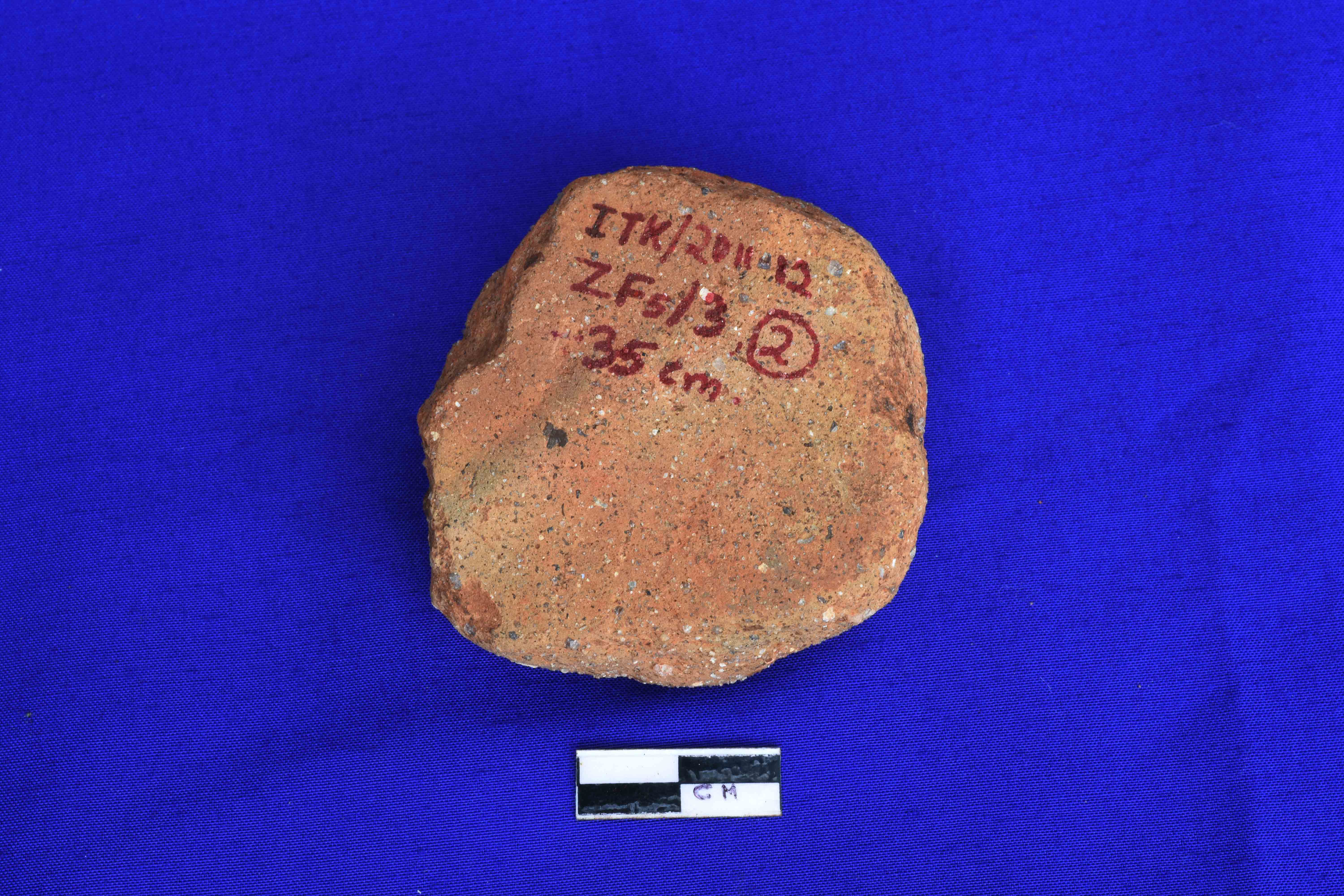 A circular terracotta Hopscotch with rough surface and rough coarse. It also has bigger sand particles and mica visible over the surface.