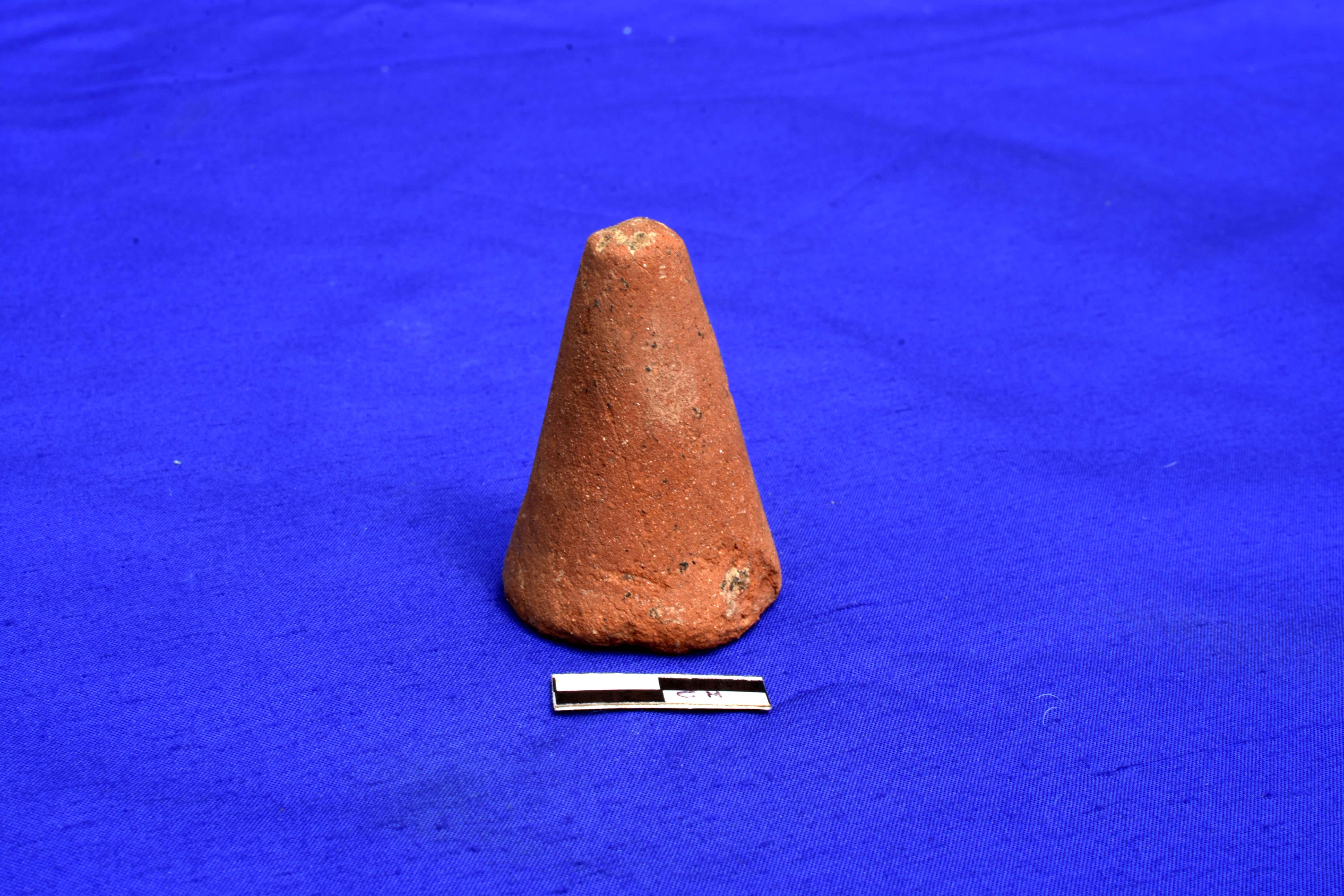 A terracotta games men made up of fine clay with canonical shape design. It is devoid of slip and is well fired and red colour.