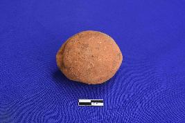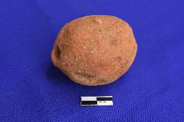 A lemon shaped bead with circular section. It is devoid of any slip and sand particles are visible over the surface. Surface is rough, well fired and red in colour.