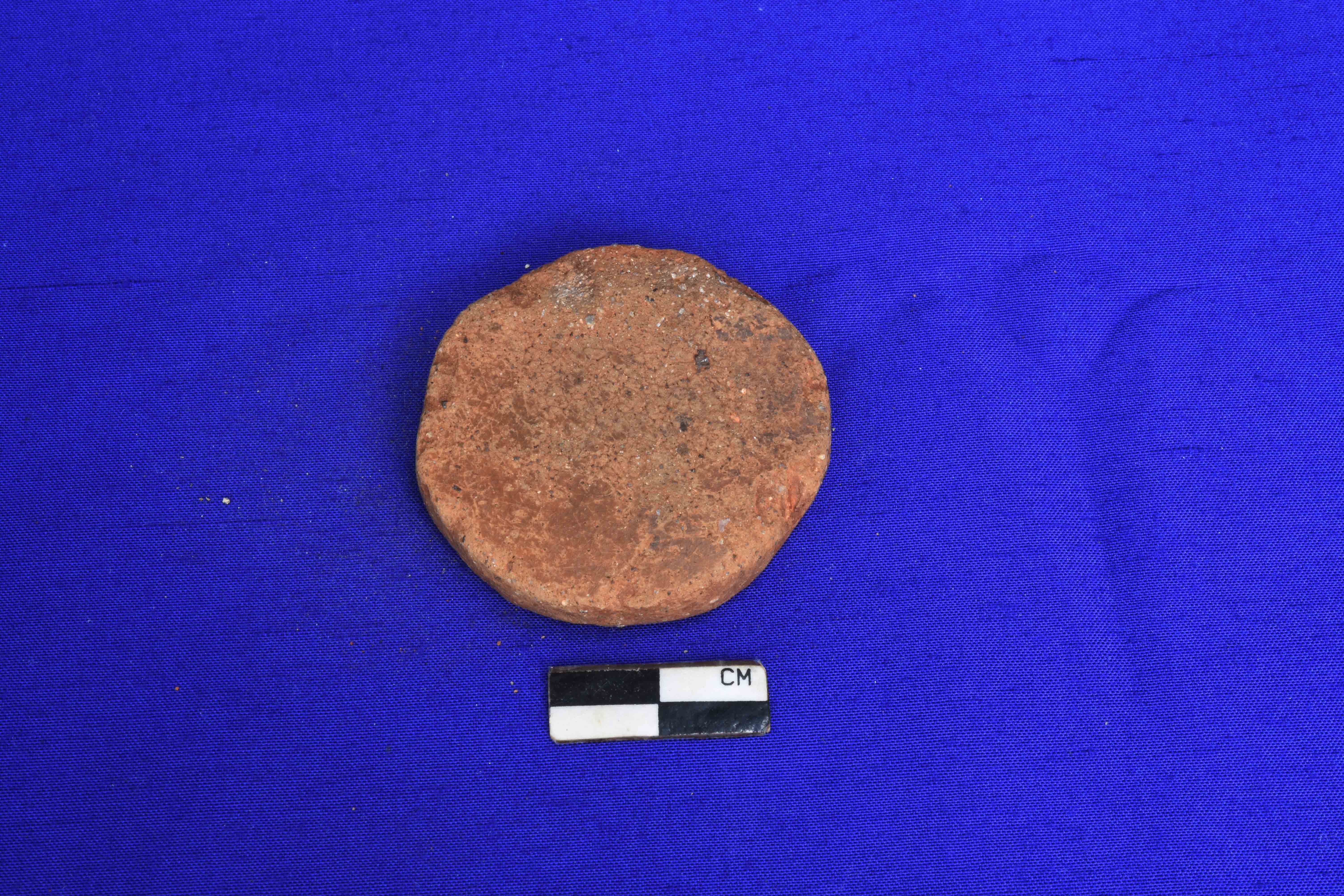 It is a terracotta hopscotch with one side being smooth and other side is rough. Sand particles are clearly visible over the surface. one side of periphery is thinner than other.