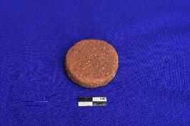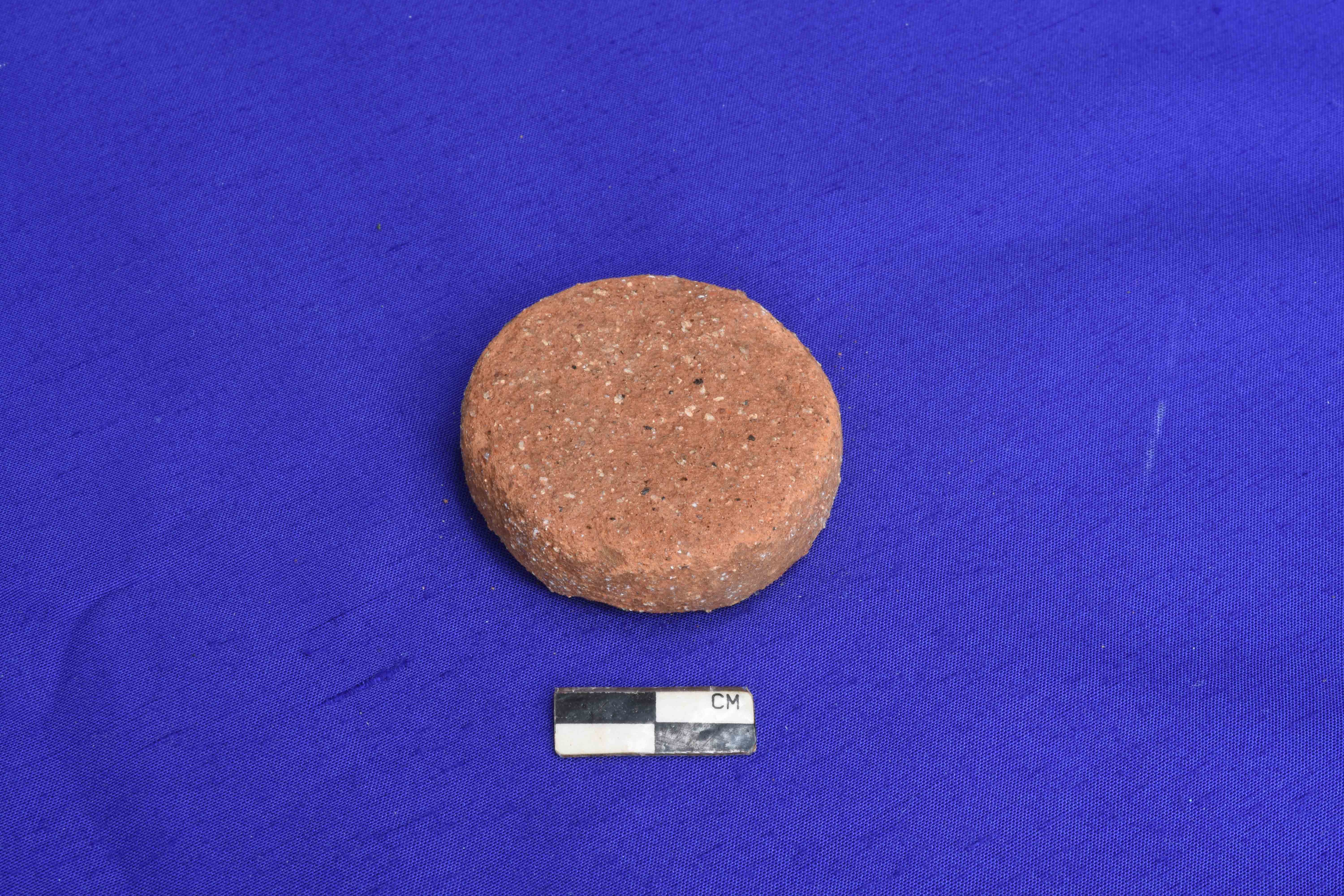 A terracotta hopscotch having rough surface on both sides. It is made of clay with sand particles visible over surface. It is devoid of any slip.