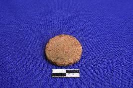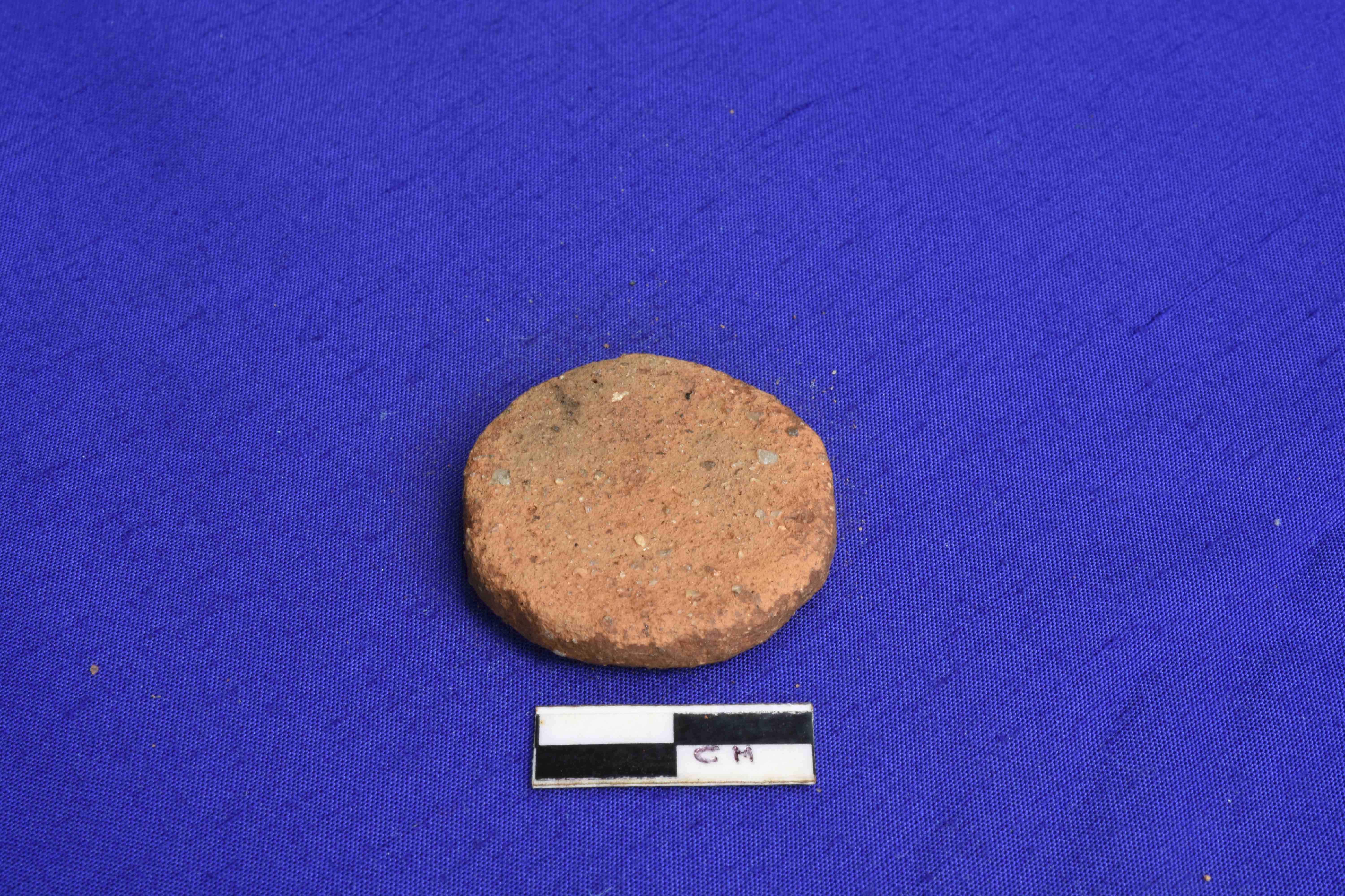 A thin Terracotta Hopscotch with symmetrical shape. Particles of mica and sand are visible both sides and have rough surface .
