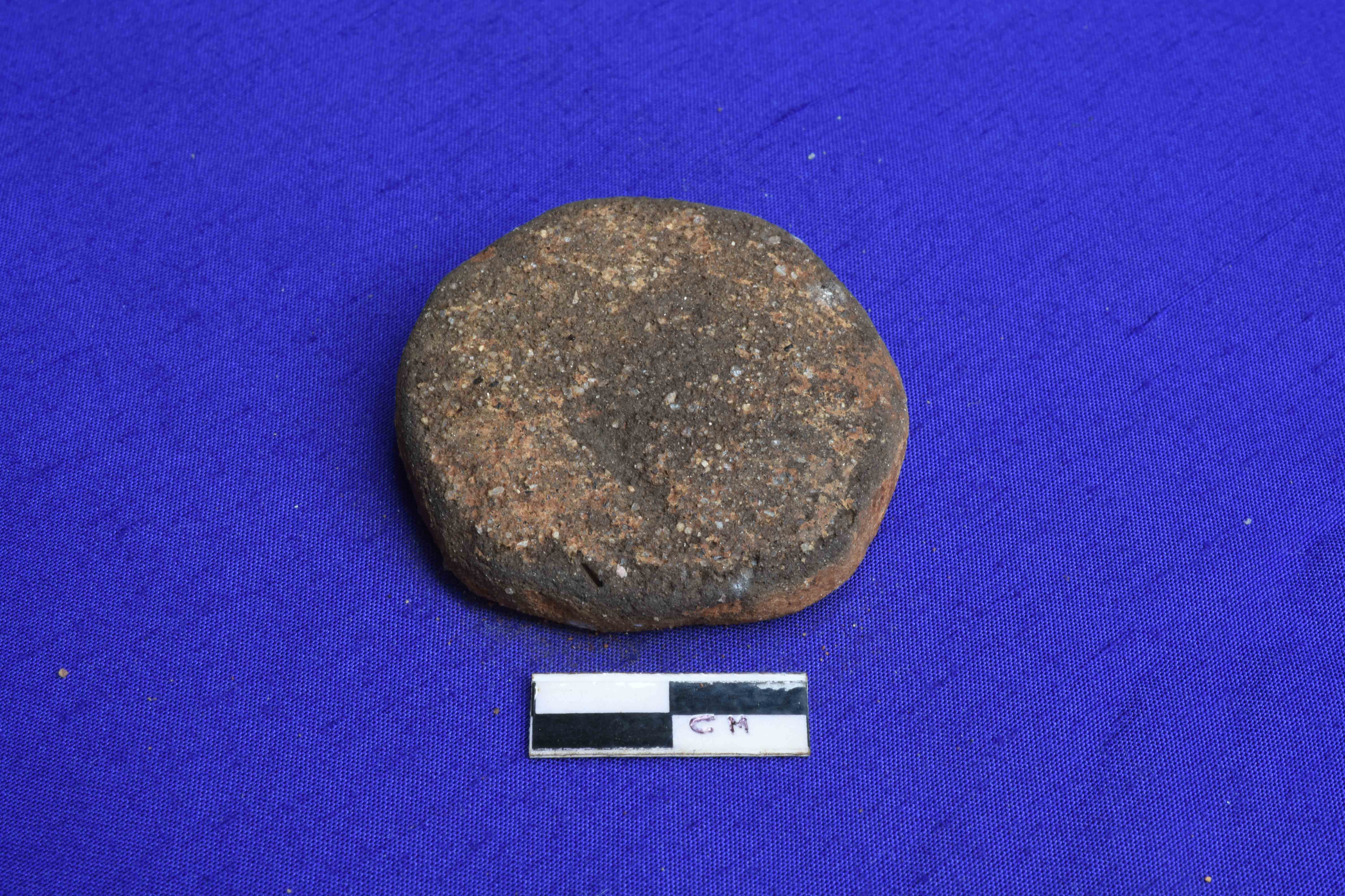 A thin Terracotta Hopscotch made of mud having sand particles over surface . Their are fired evidence on the both side of hopscotch.