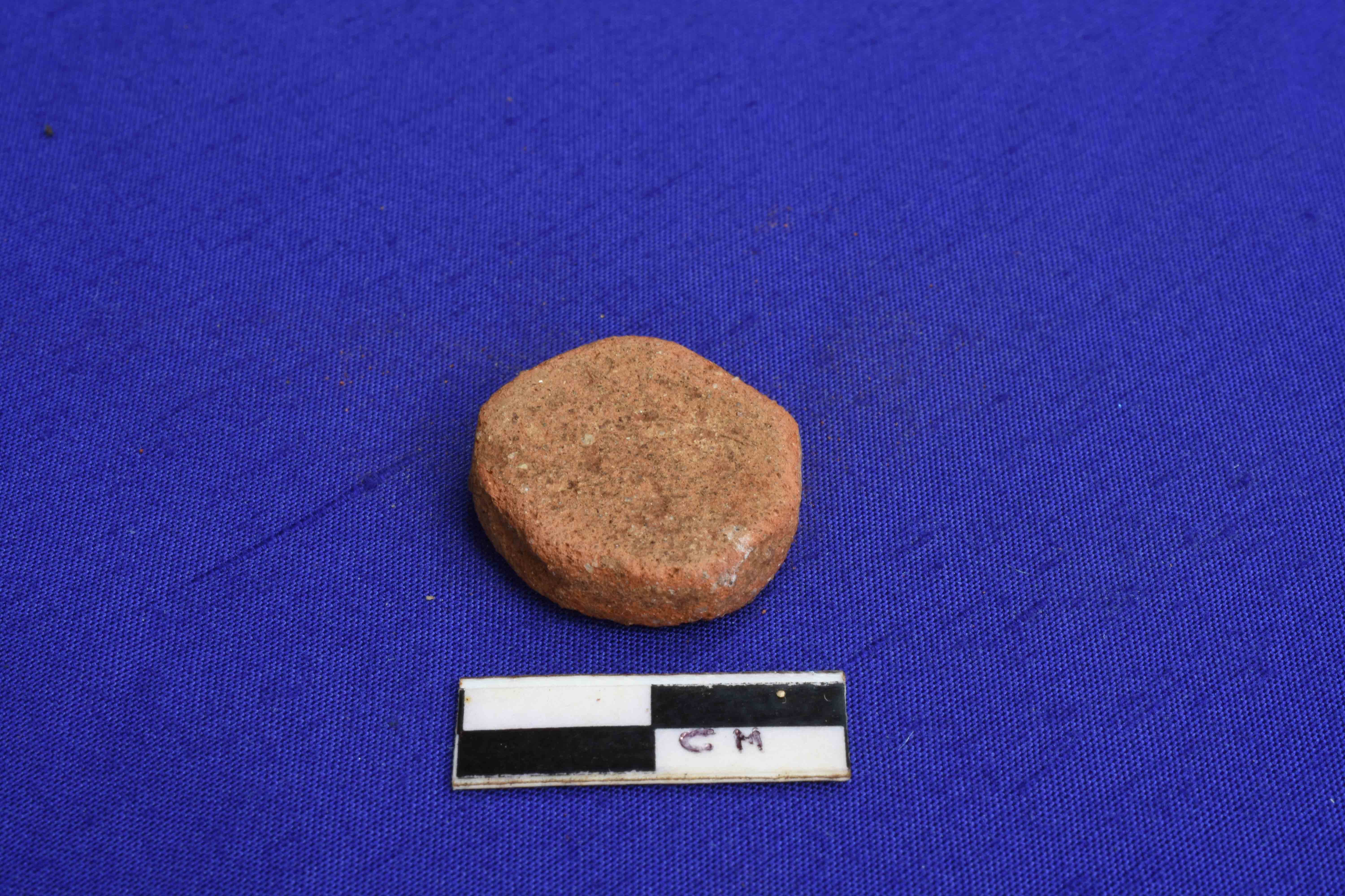 It is a terracotta Hopscotch of red colour. It is devoid of any slip and well fired .