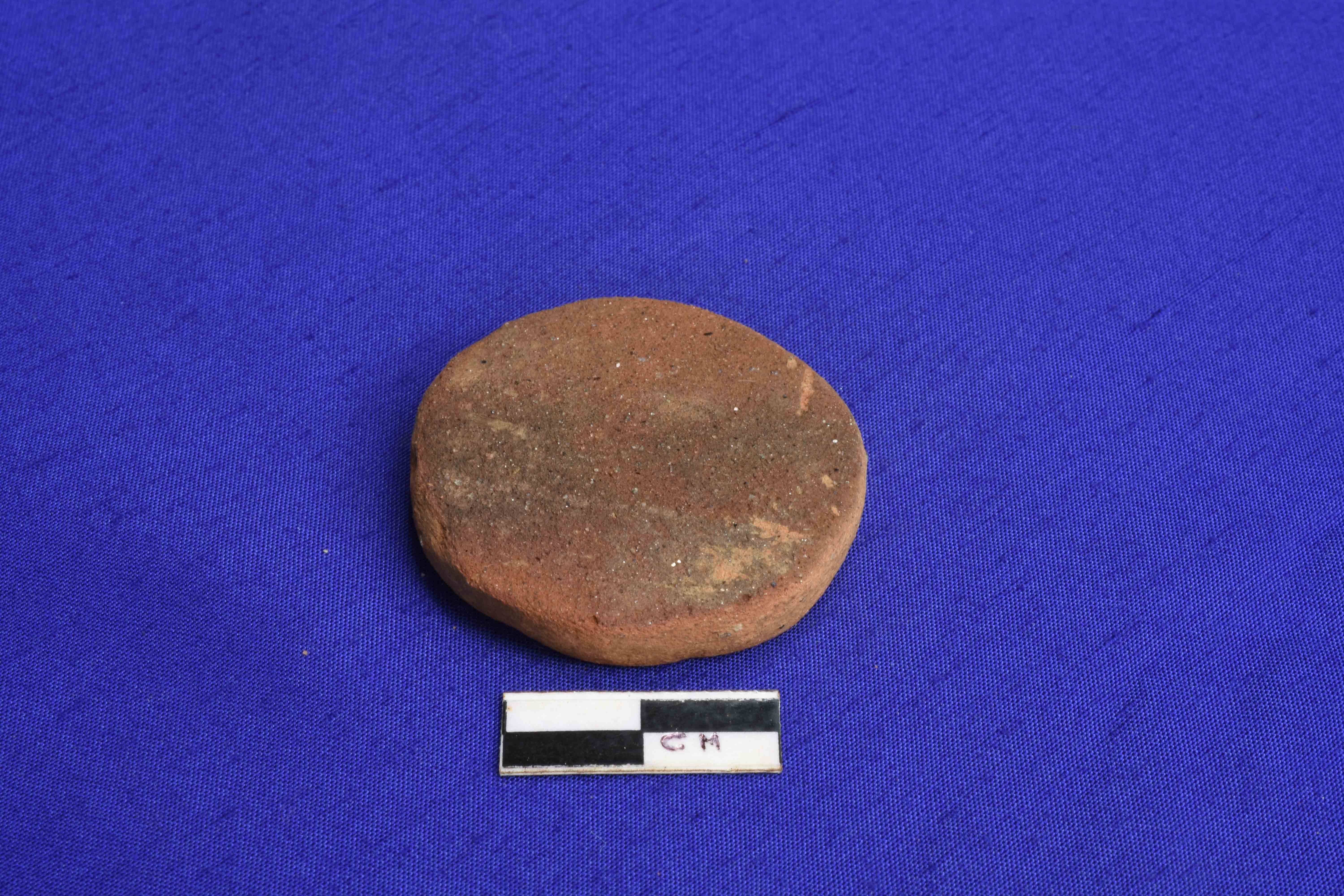 A Terracotta Hopscotch, red in colour with mica contains visible over surface .The shape is symmetrical.