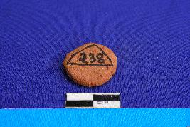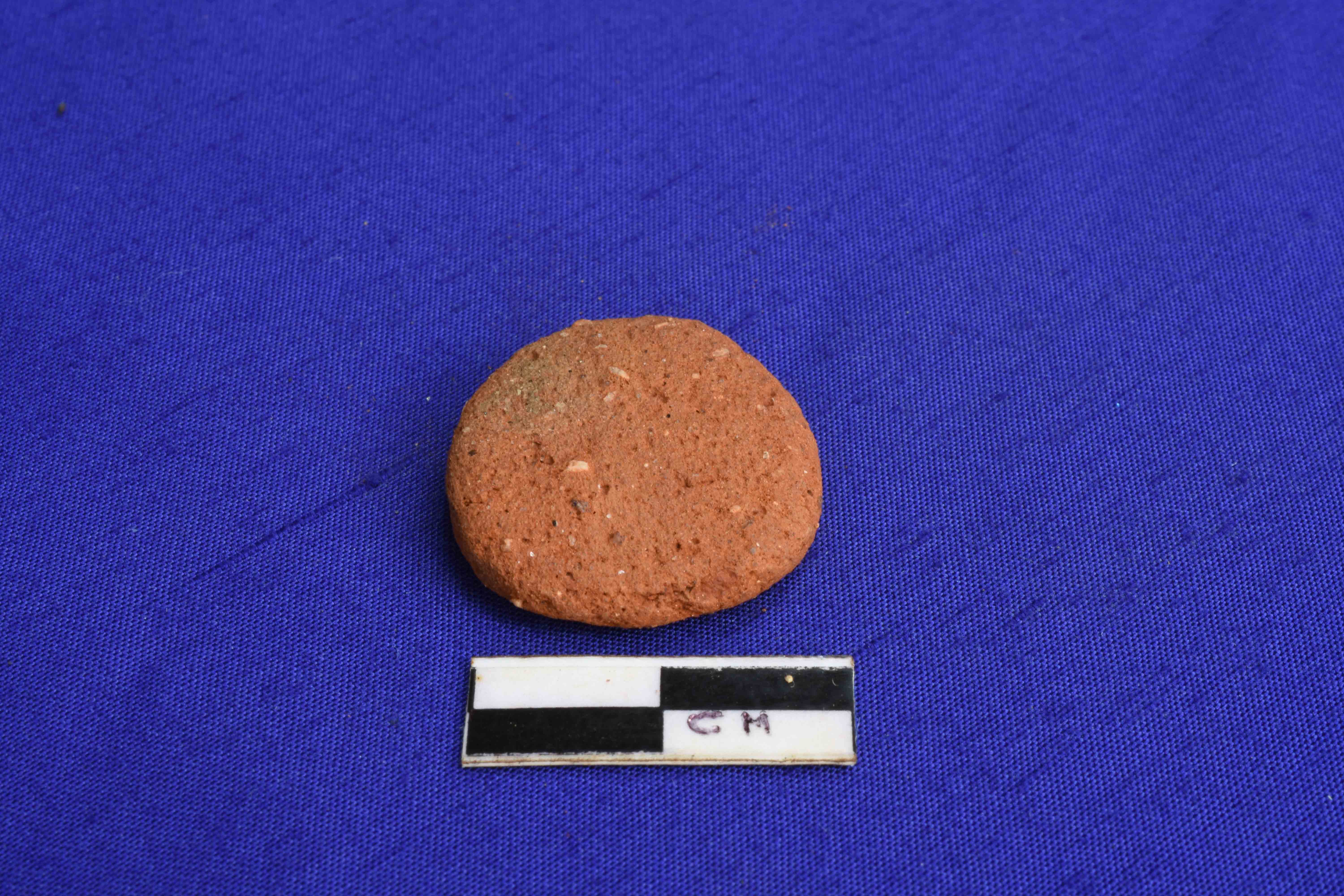 A terracotta hopscotch which is red in color with particles of sand visible over the surface.