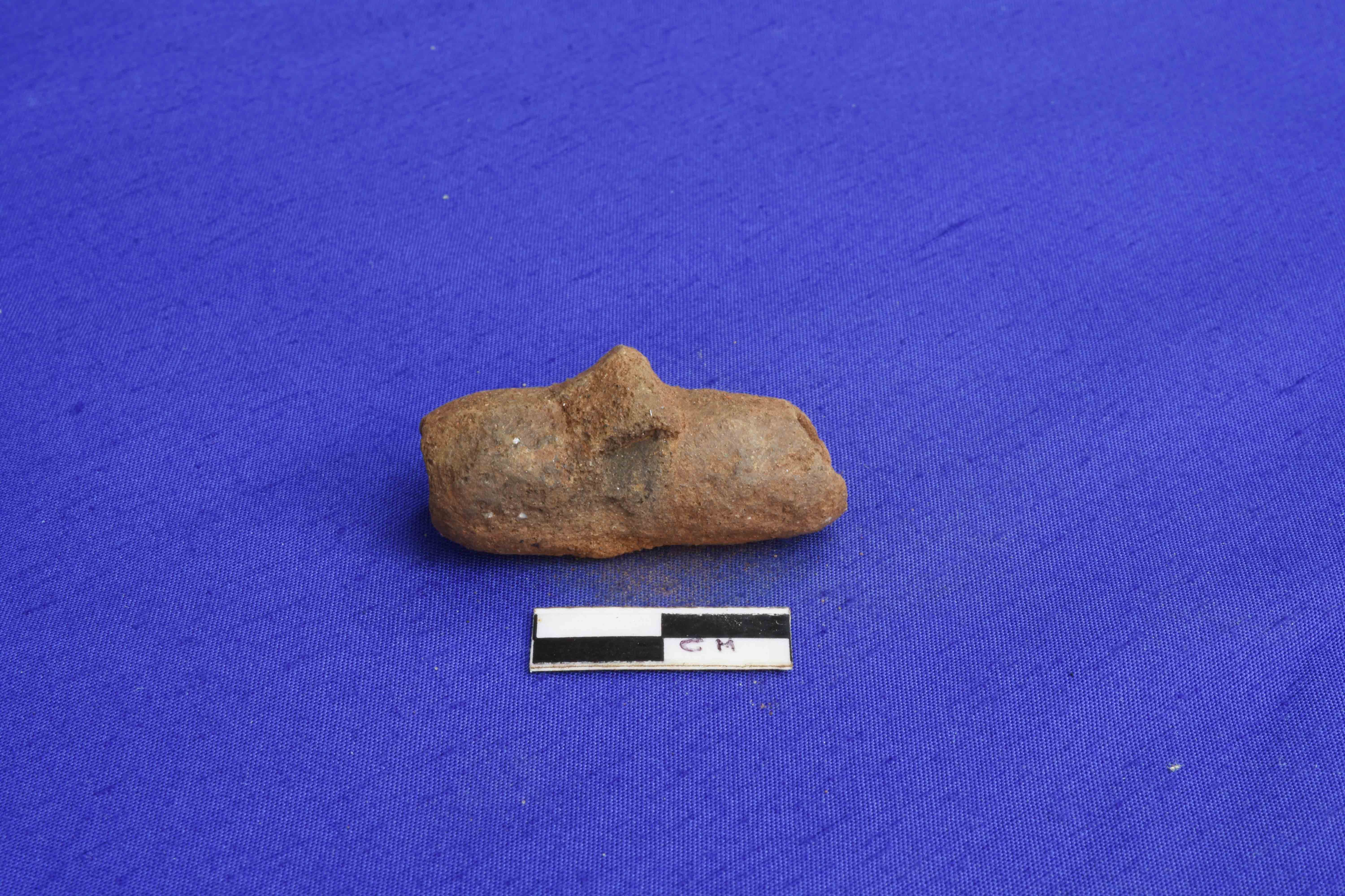 A long cylindrical Terracotta Bead with circular section having prominent ridge on the body in the middle . It is well fired and devoid of any slip .