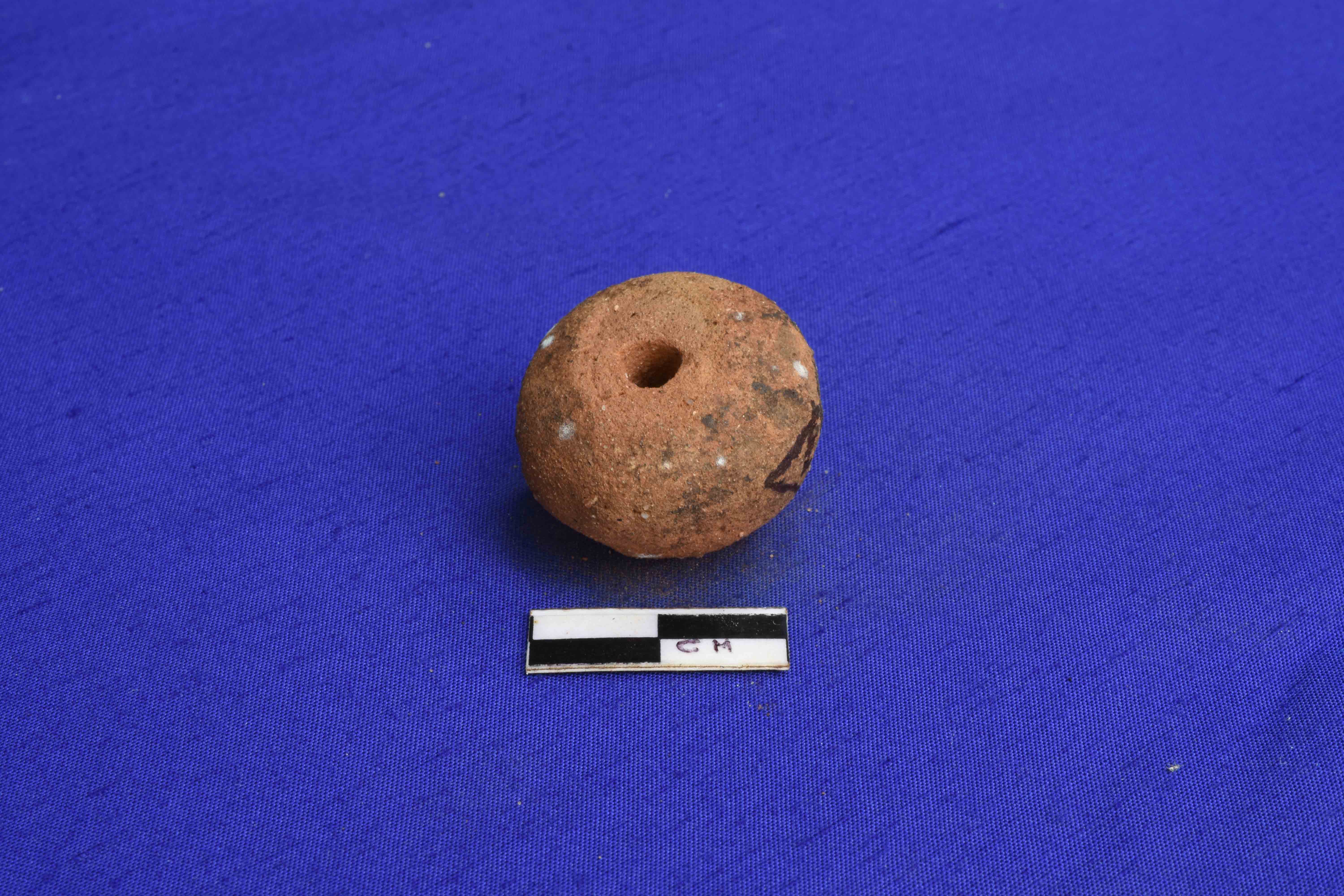 A ghat shaped terracotta bead with rough surface. It is well fired and is red in colour.