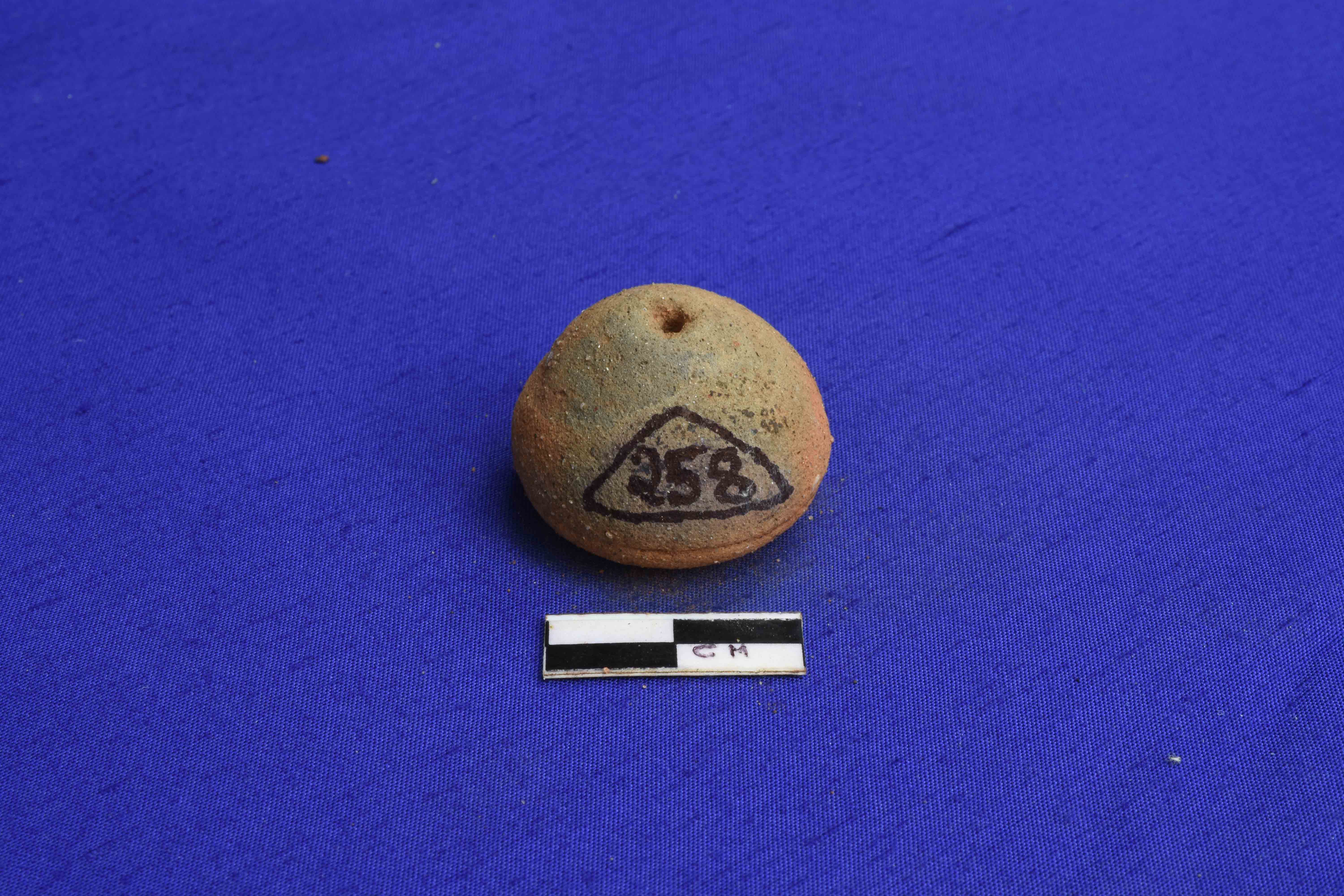 A Ghat shaped Terracotta Bead with rough surface and groove around the body. It is well fired, red in colour and devoid of any slip.