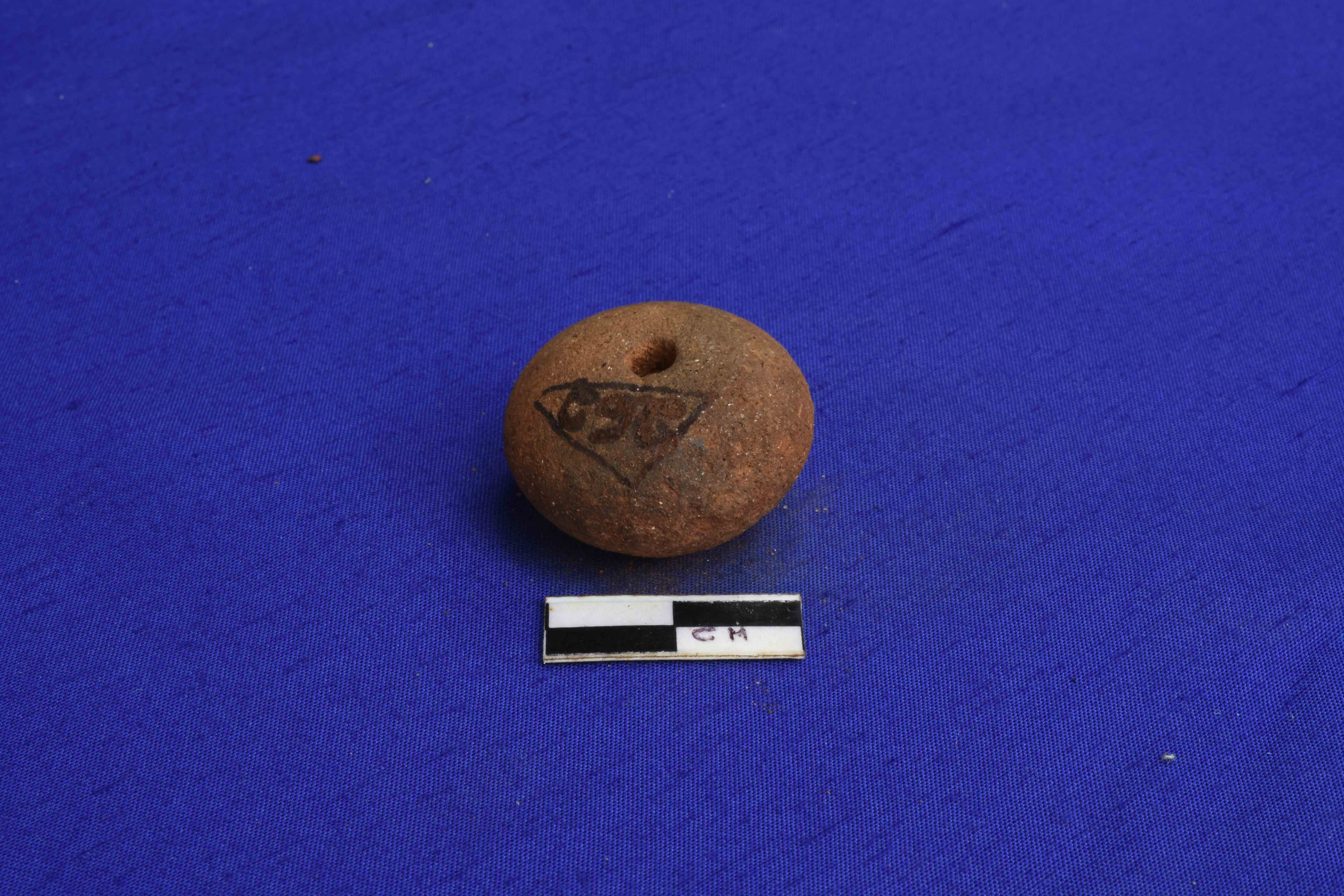A disc shaped terracotta bead. It is well fired and is red in colour. It is devoid of any slip.
