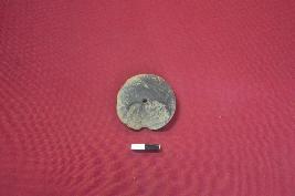 | Description / विवरण | A terracotta wheel. It is thicker in the middle on one side while other side is flat and have a hole in the middle. The surface of the object is rough. Chipping can also be seen, and edge is partially broken. |