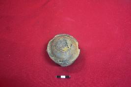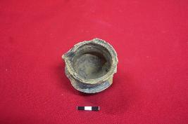 | Description / विवरण | Terracotta lamp, circular in shape, slightly out turned rim, wick is intact and slip treatment given in black colour. Edges are partially broken and it has flat base. |