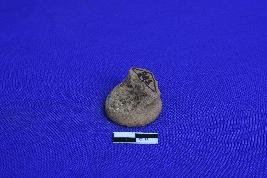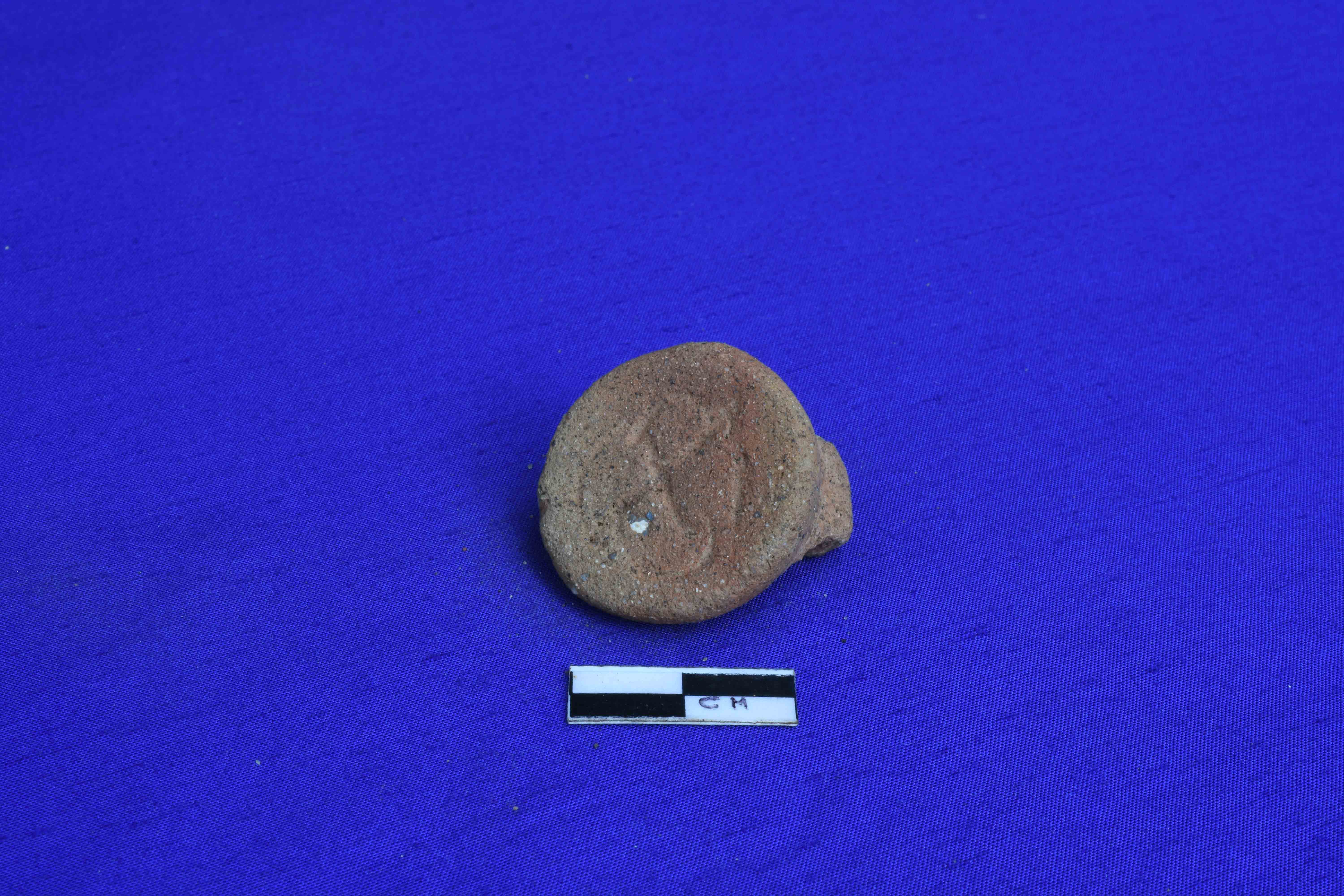 A Terracotta Ear spool with solid cylindrical body, narrow in the middle part. One of the side is partially broken and is rubbed off.