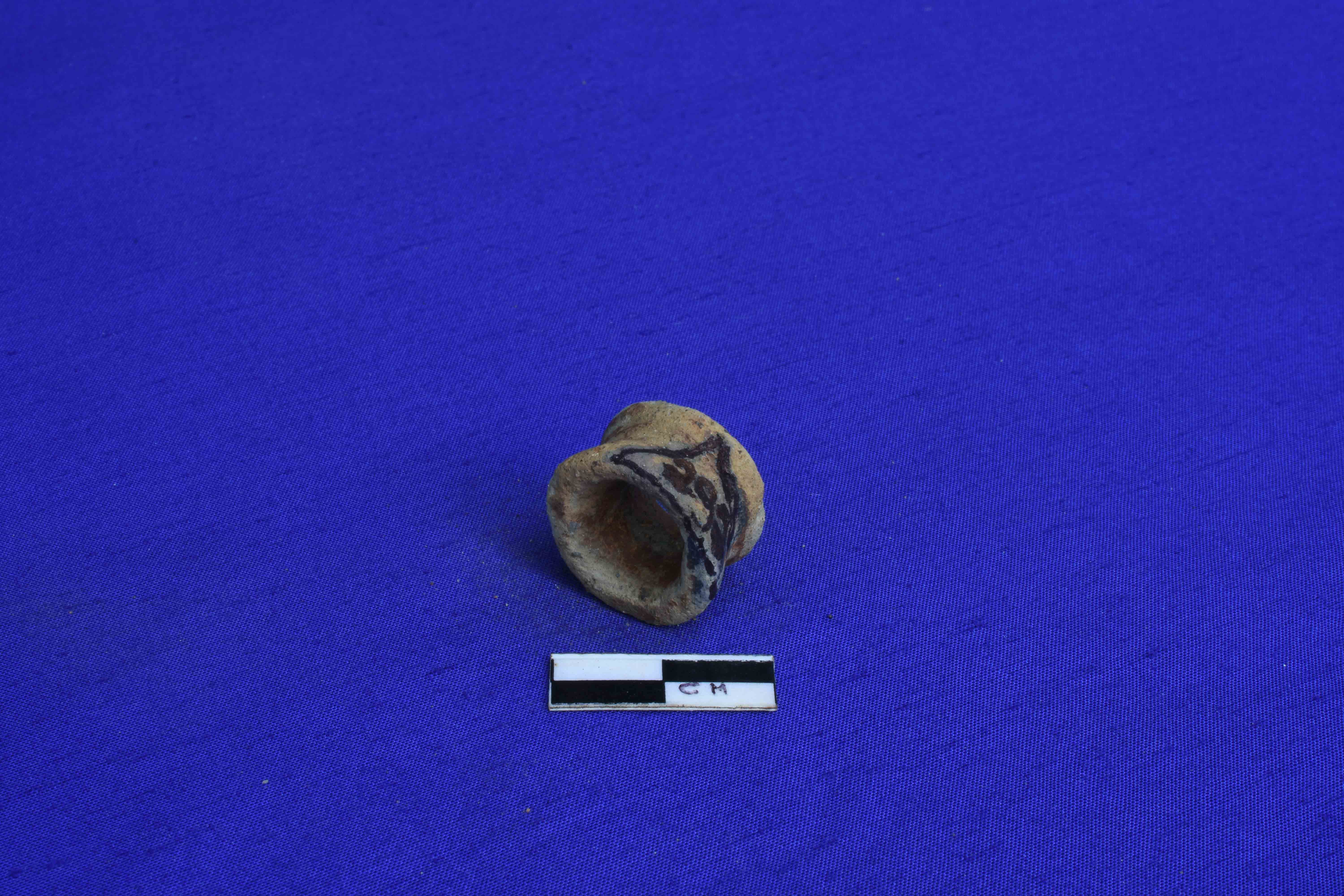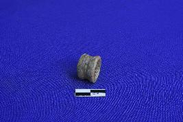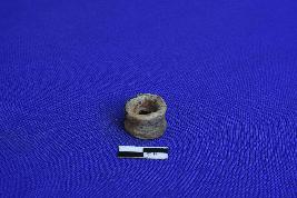 A terracotta Ear spool with hallo body, cylindrical shape having a groove in the middle body. A perforation is available with diameter of 0.3 cm. It is well fired and is grey in colour.