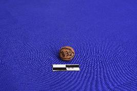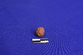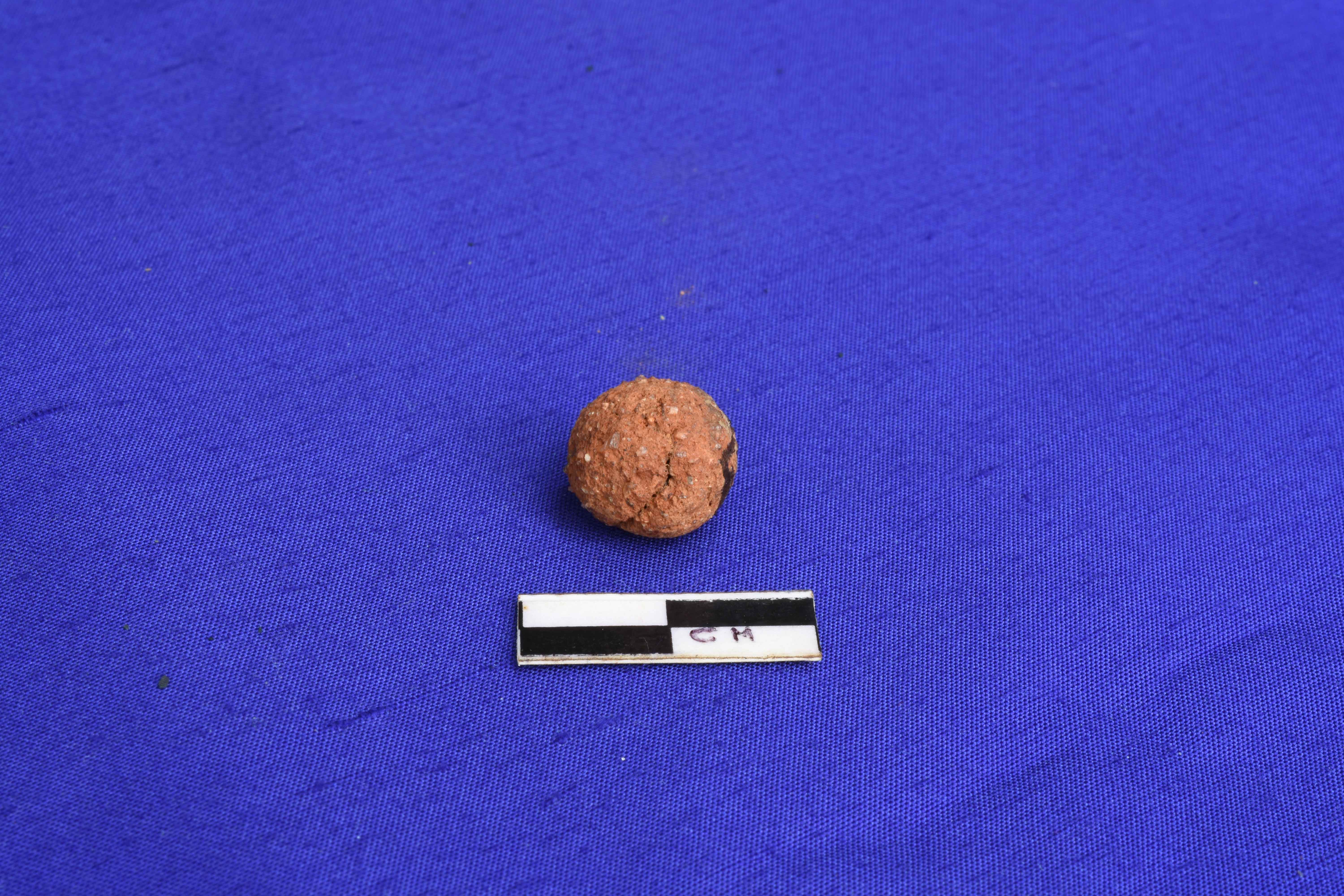 A small well fired terracotta sling ball with a very rough surface.