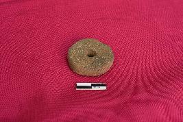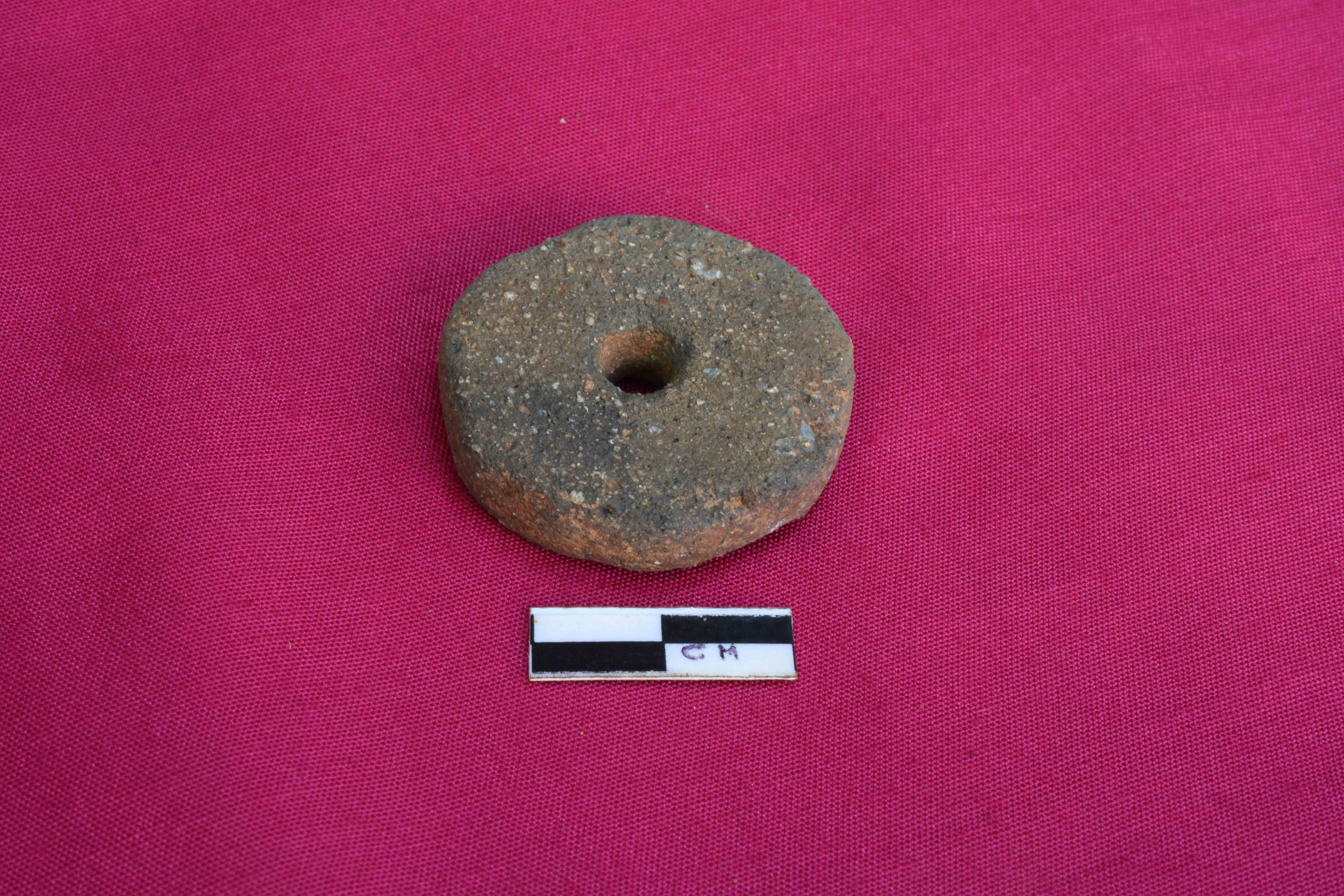 A circular shape toy cartwheel with a rough surface and the stone particles are visible. It is dull red in colour due to ill firing. It is devoid of slip.