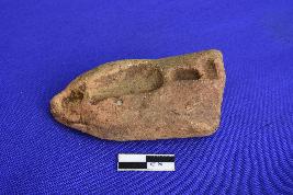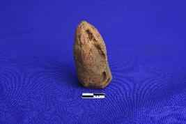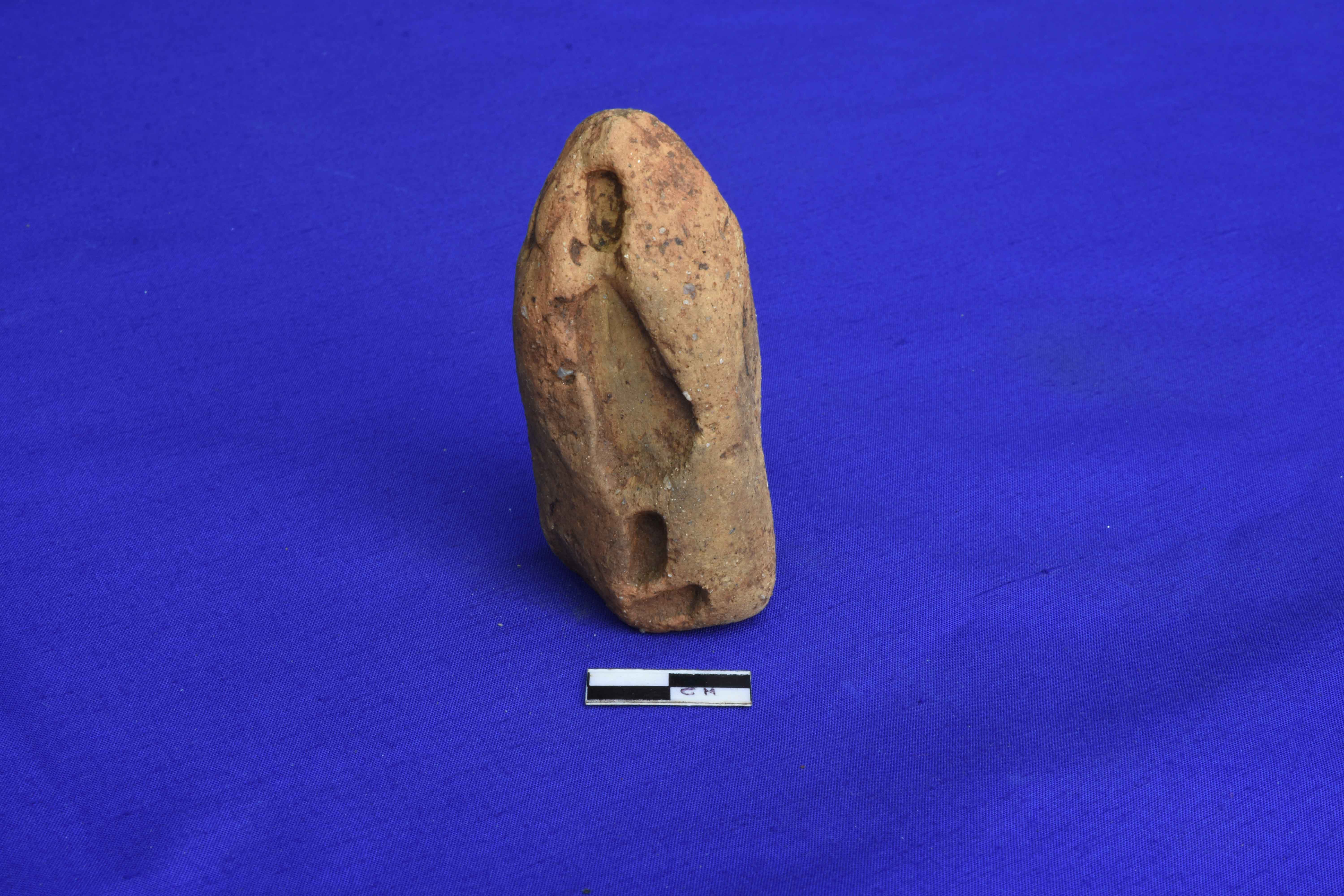 A long Cylindrical rough Terracotta votive object with a flat back and pointed top. It is dull red in colour, ill fired, and devoid of slip