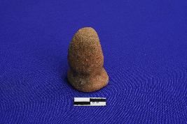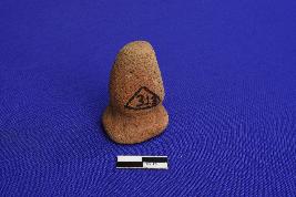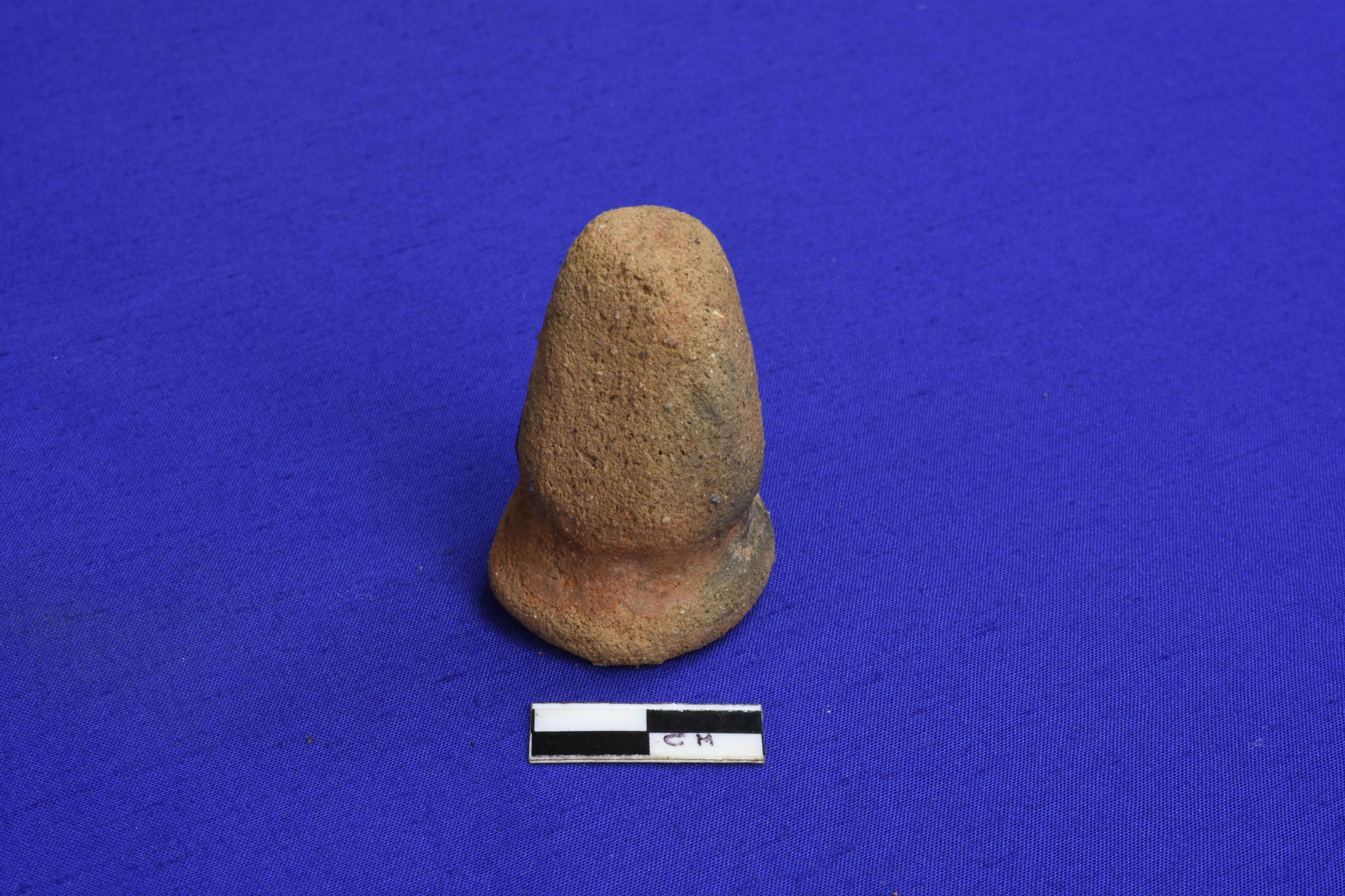 A terracotta Gamesman with a wide circular base and conical upper body. It is ill fired and devoid of slip.