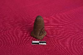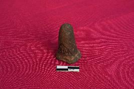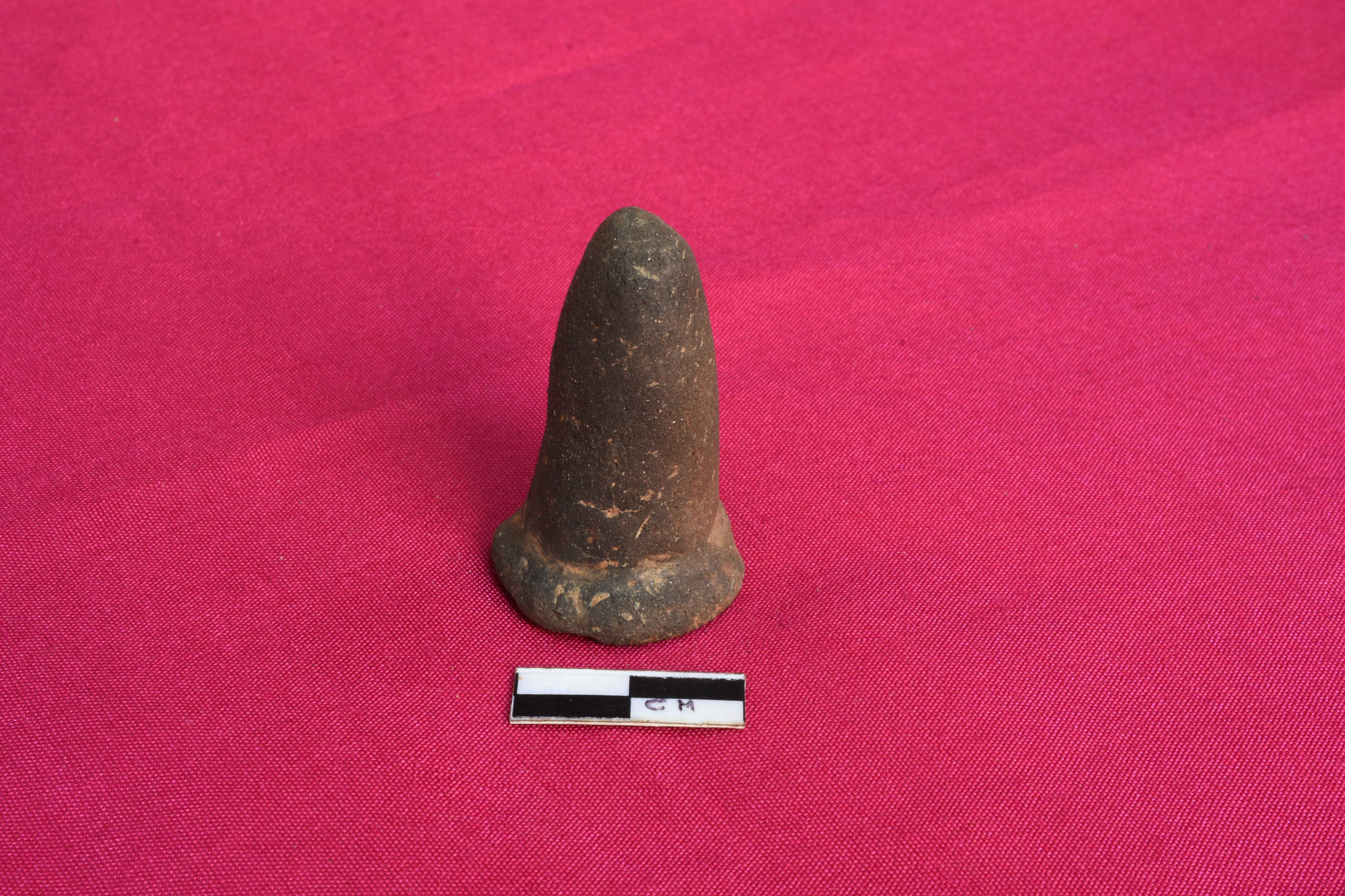 A Terracotta gamesman with a circular flat base and curvilinear body. It is ill fired and devoid of slip.