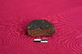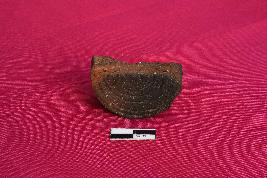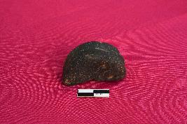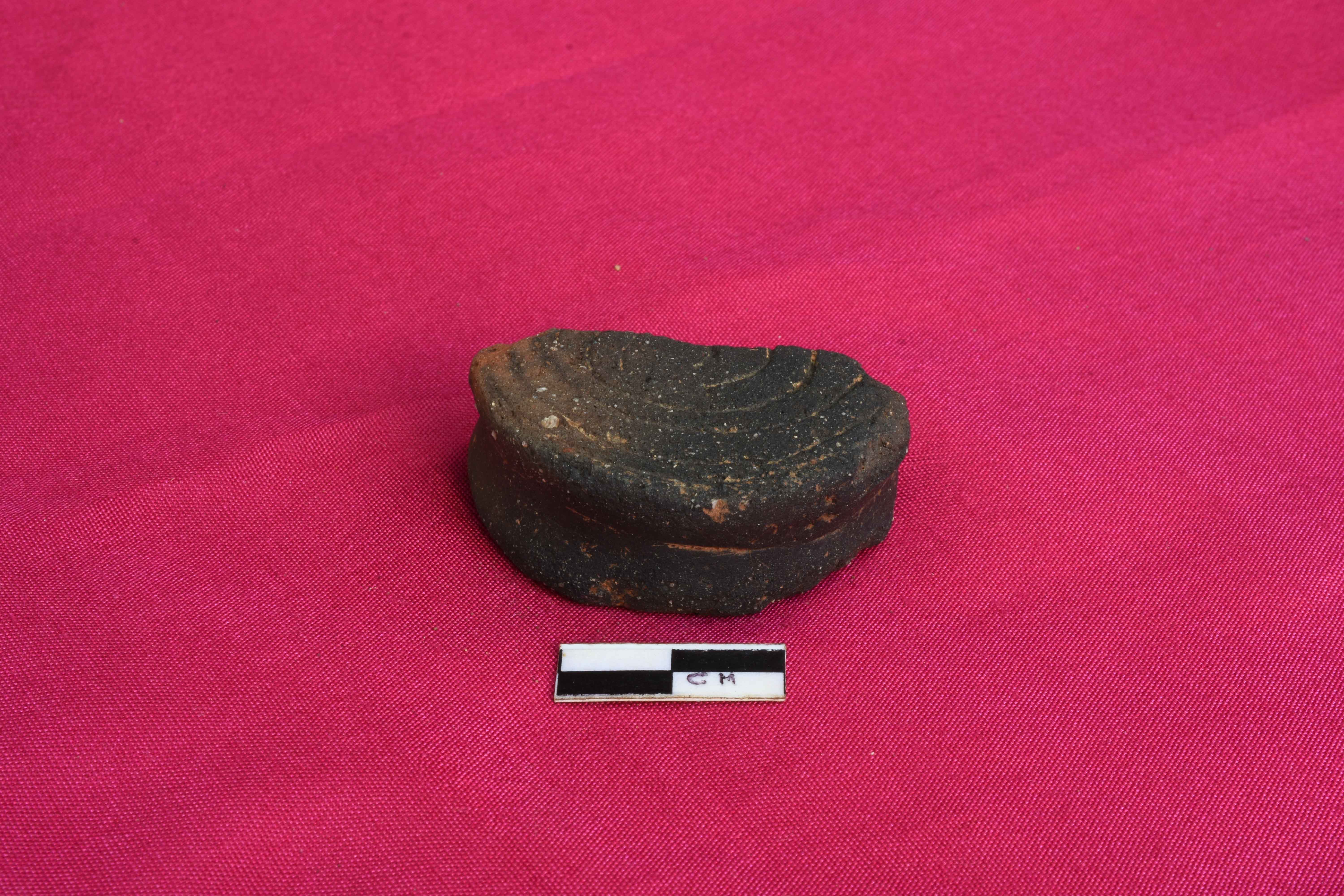 It is a half broken short solid terracotta ear spool. The outer face is decorated with spiral motif. It is blackish in colour due to ill firing and devoid of any slip.