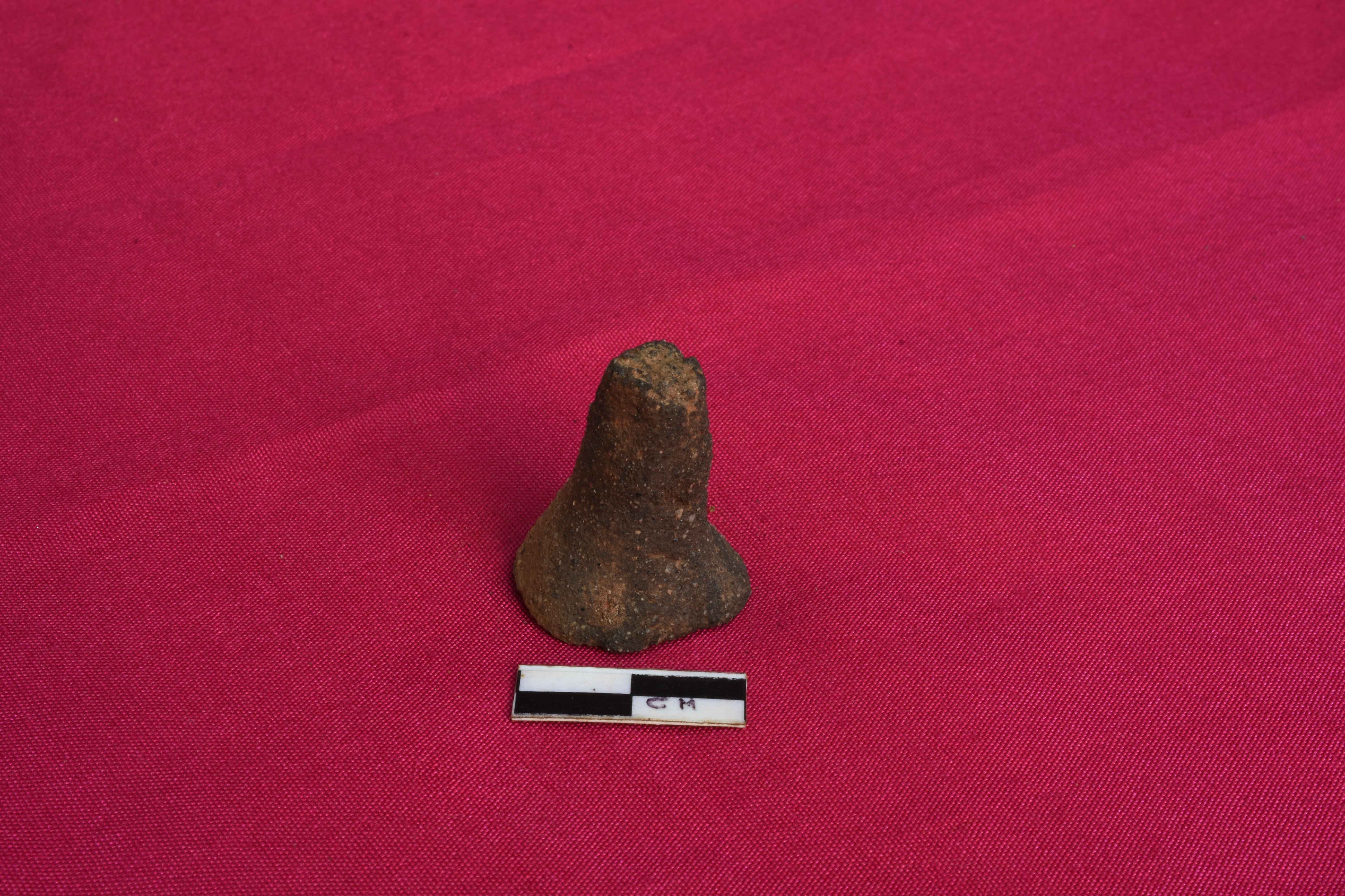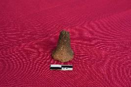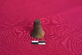 It is a terracotta games-men with a conical top with groove on its base. It is ill fired and is dull red in colour.