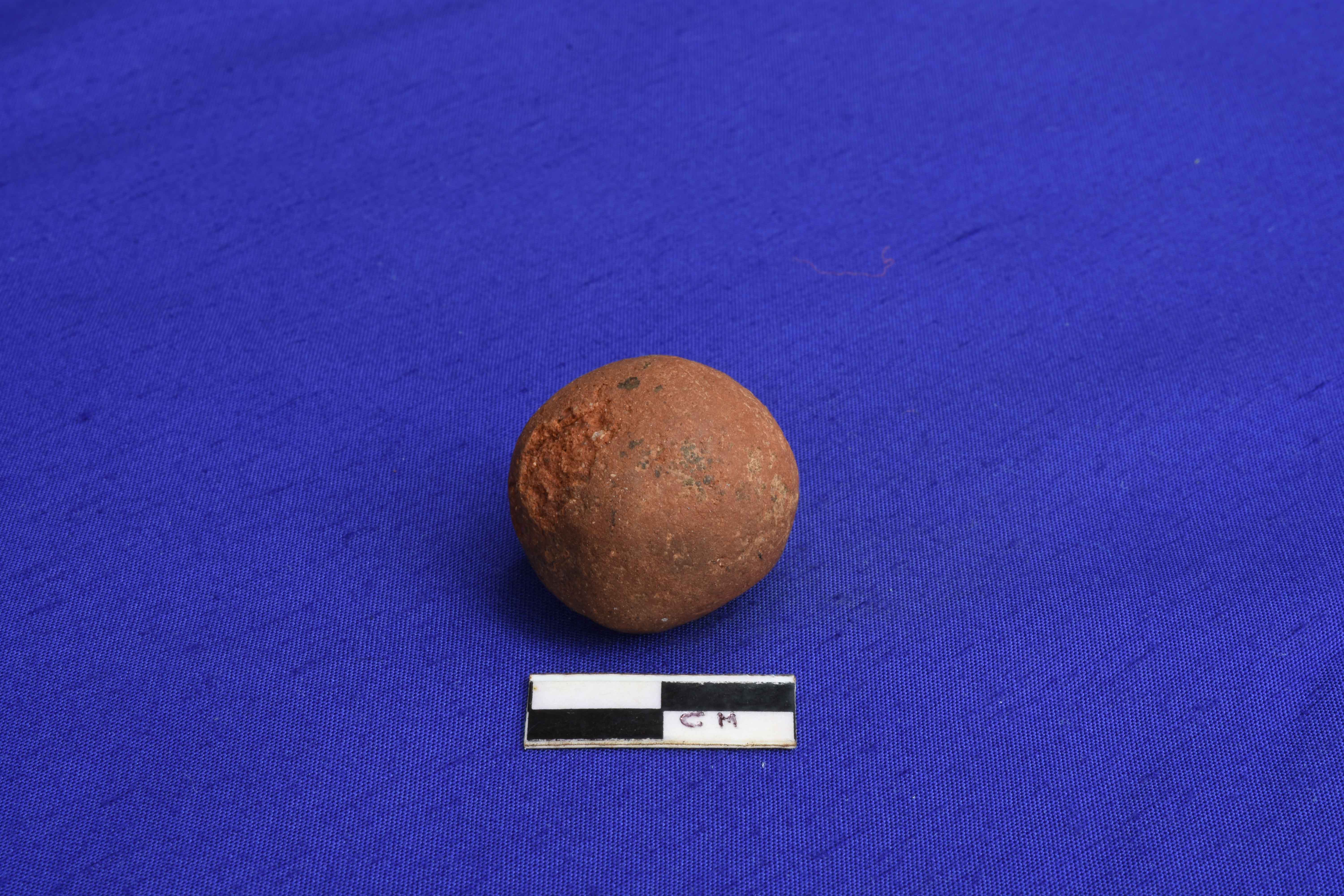 A Terracotta sling Ball, well fired with a rough surface. Devoid of any slip.