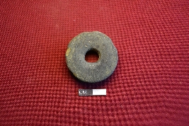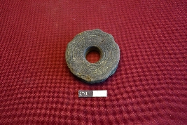 | Description / विवरण | Terracotta Ear-stud with concentric lines in one side. It is centrally perforated, and surface treated with blackslip. |