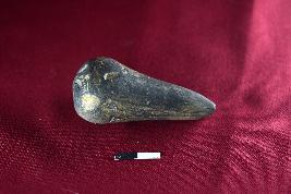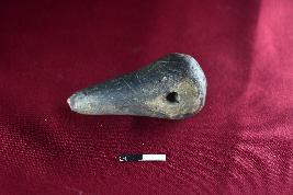 | Description / विवरण | A handmade terracotta stopper made with fine clay having pointed tip, semi-rounded base and black in colour. The surface of the object is smooth. There is a small hole on the surface. |