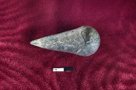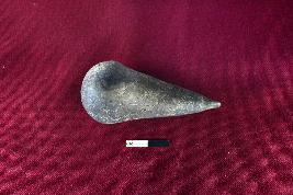 | Description / विवरण | A Terracotta stopper black in colour having rounded base, pointed tip, smooth surface and well baked clay was used. Cracks are visible on the surface. |