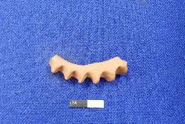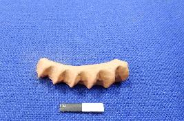 | Description / विवरण | Fragment of terracotta bangle with smooth and slightly uneven surface, circular in cross section. Surface is decorated with outward triangular design. |