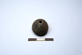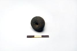 | Description / विवरण | Terracotta wheel made bead, it is areca nut in shape. It has central depression on one end with a perforation and surface treated with chocolate slip. |