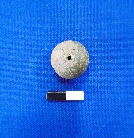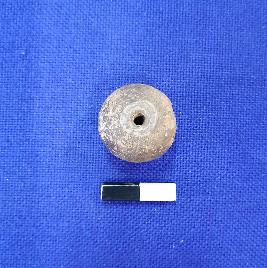| Description / विवरण | Terracotta wheel made bead in areca nut shape, concentric lines, central depression on end with a perforation, surface treated with black slip. There are some irregular marks are visible on the surface. |