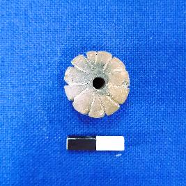 | Description / विवरण | Terracotta bead of Amalaka shape and the colour of the object is red. There are some irregular marks on the surface. |