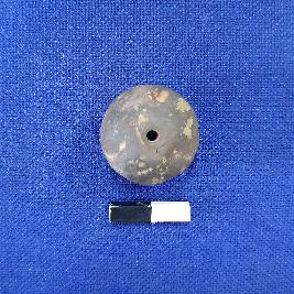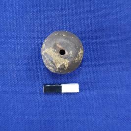 | Description / विवरण | Terracotta bead in spherical shape with a perforation, surface treated with black slip. There are some irregular marks visible on the surface. |