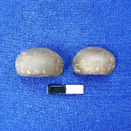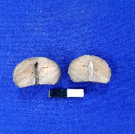 | Description / विवरण | Terracotta bead in areca nut shape, centrally perforation, surface treated with black slip. This object is broken and divided into two parts. |