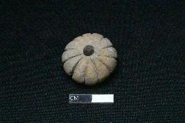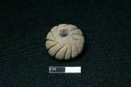 | Description / विवरण | Terracotta wheel made bead in almost spherical shape, it has vertical grooving on its body. The object is centrally perforated and circular cross section. |