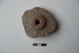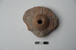 | Description / विवरण | Spoked wheel with protruding hub in the centre. The edge is missing all around. Nineteen spokes can be counted on both sides of the wheel. It is red in color. |