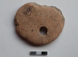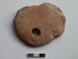 | Description / विवरण | Net sinker of circular shape. Some portion is missing. One hole near the edged portion. It is red in colour |