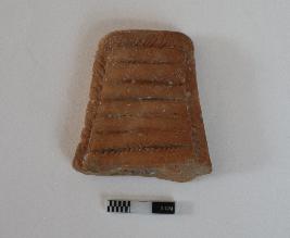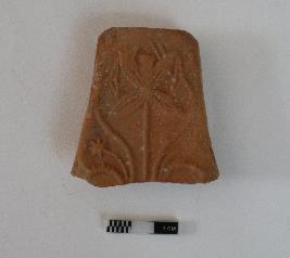 | Description / विवरण | Decorative terracotta object depicting flower relief designs on one side and grooved lines design on the other sides. One end portion is missing. |