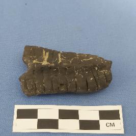 | Description / विवरण | The black colour unidentified object has one narrow end. It has incised design over upper body which is divided in two parts by a long horizontal pinched line. |
