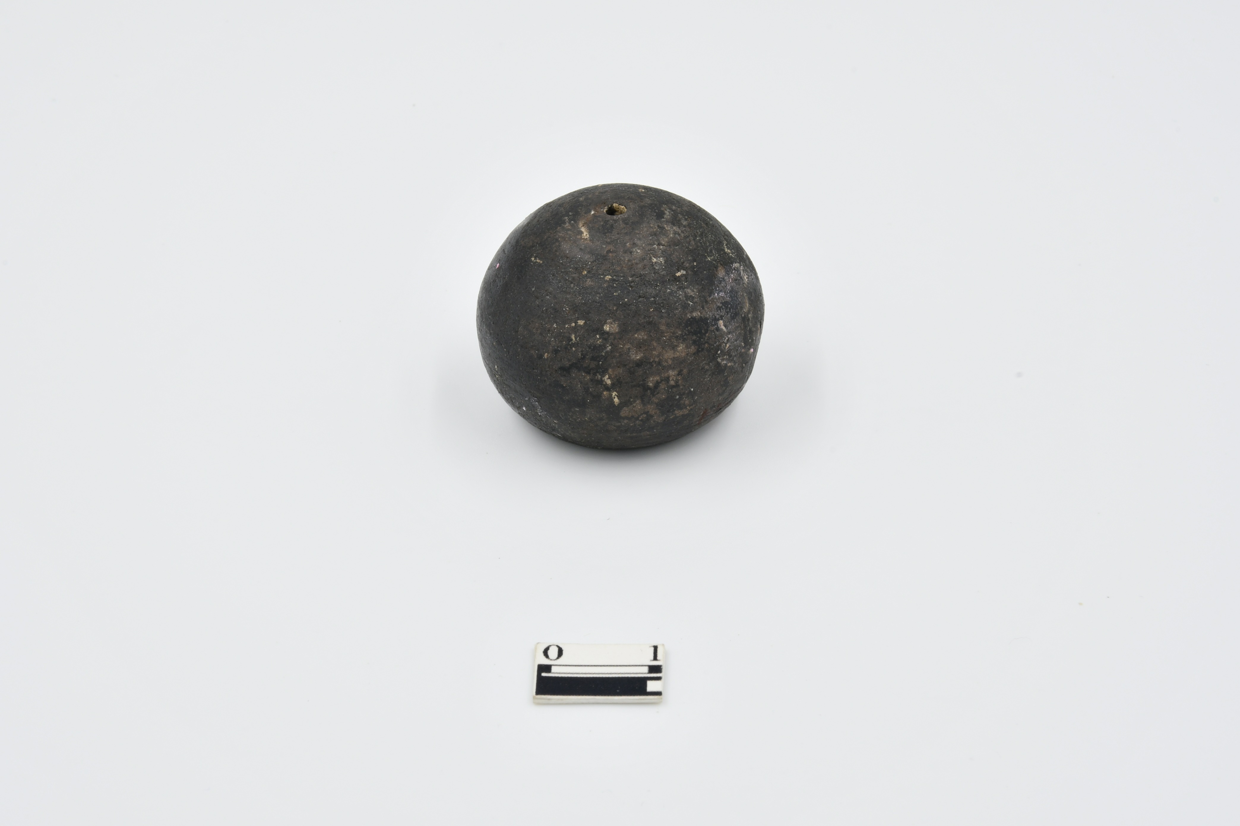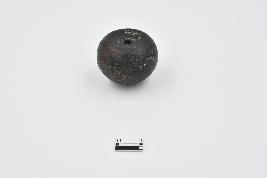 Areca-nut shape terracotta bead. Partially chipped, chipped on outer surface, black in color