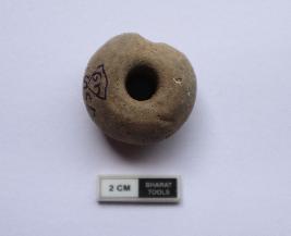 | Description / विवरण | Terracotta bead of ghat shape. It is dull red in colour. It is partially damaged |